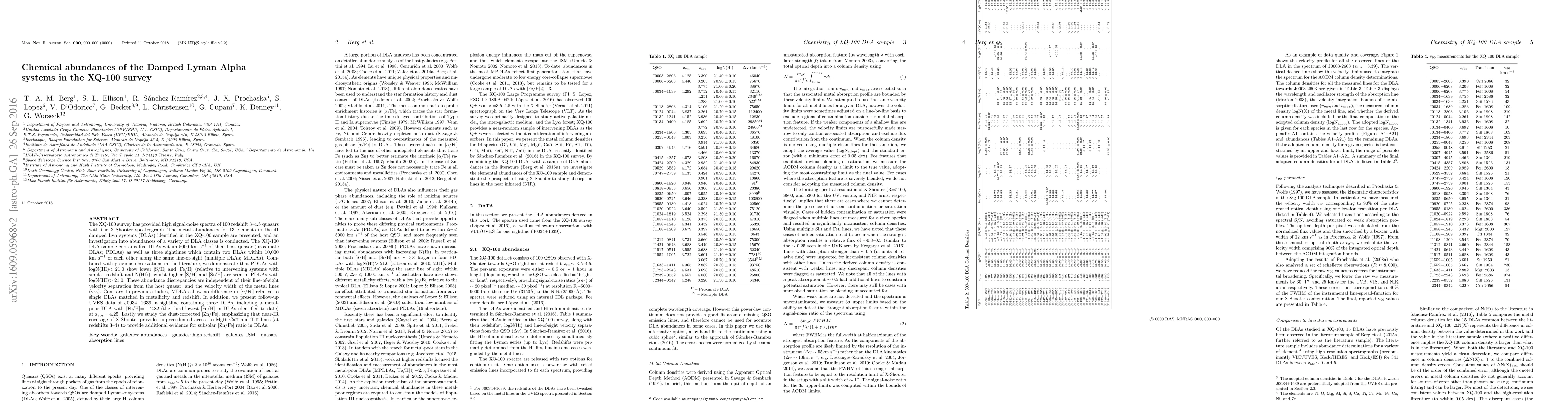 The XQ-100 survey has provided high signal-noise spectra of 100 redshift 3-4.5 quasars with the X-Shooter spectrograph. The metal abundances for 13 elements in the 41 damped Lyman alpha systems (DLAs) identified in the XQ-100 sample are presented, and an investigation into abundances of a variety of DLA classes is conducted. The XQ-100 DLA sample contains five DLAs within 5000 km/s of their host quasar (proximate DLAs; PDLAs) as well as three sightlines which contain two DLAs within 10,000 km/s of each other along the same line-of-sight (multiple DLAs; MDLAs). Combined with previous observations in the literature, we demonstrate that PDLAs with logN(HI)<21.0 show lower [S/H] and [Fe/H] (relative to intervening systems with similar redshift and N(HI)), whilst higher [S/H] and [Si/H] are seen in PDLAs with logN(HI)>21.0. These abundance discrepancies are independent of their line-of-sight velocity separation from the host quasar, and the velocity width of the metal lines (v90). Contrary to previous studies, MDLAs show no difference in [alpha/Fe] relative to single DLAs matched in metallicity and redshift. In addition, we present follow-up UVES data of J0034+1639, a sightline containing three DLAs, including a metal-poor DLA with [Fe/H]=-2.82 (the third lowest [Fe/H] in DLAs identified to date) at z=4.25. Lastly we study the dust-corrected [Zn/Fe], emphasizing that near-IR coverage of X-Shooter provides unprecedented access to MgII, CaII and TiII lines (at redshifts 3-4) to provide additional evidence for subsolar [Zn/Fe] ratio in DLAs.