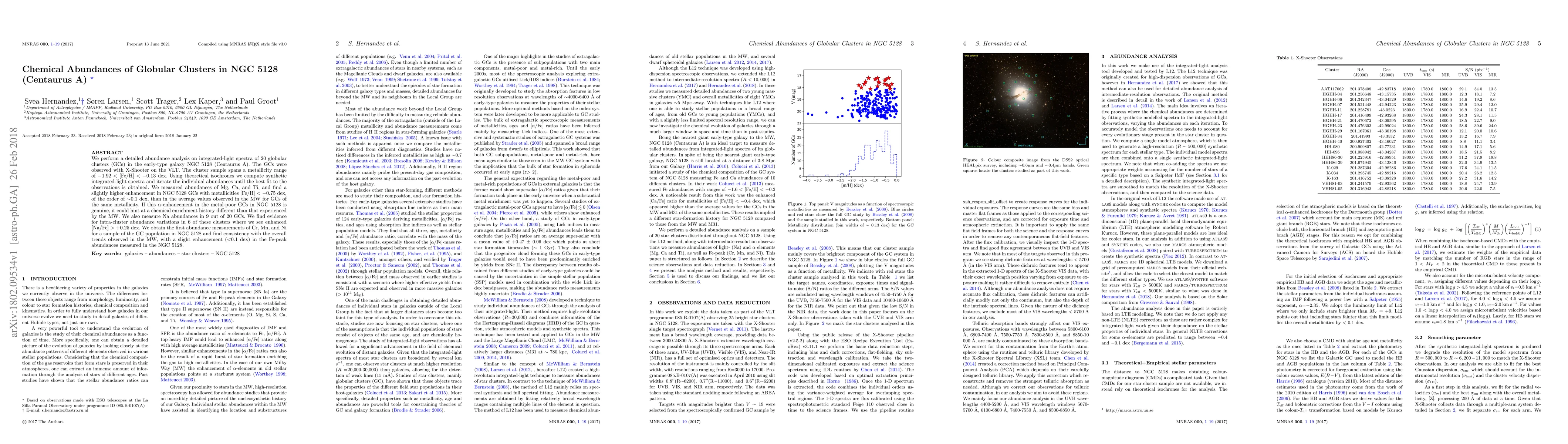 We perform a detailed abundance analysis on integrated-light spectra of 20 globular clusters (GCs) in the early-type galaxy NGC 5128 (Centaurus A). The GCs were observed with X-Shooter on the VLT. The cluster sample spans a metallicity range of $-1.92 < $ [Fe/H] $< -0.13$ dex. Using theoretical isochrones we compute synthetic integrated-light spectra and iterate the individual abundances until the best fit to the observations is obtained. We measured abundances of Mg, Ca, and Ti, and find a slightly higher enhancement in NGC 5128 GCs with metallicities [Fe/H] < $-$0.75 dex, of the order of $\sim$0.1 dex, than in the average values observed in the MW for GCs of the same metallicity. If this $\alpha$-enhancement in the metal-poor GCs in NGC 5128 is genuine, it could hint at a chemical enrichment history different than that experienced by the MW. We also measure Na abundances in 9 out of 20 GCs. We find evidence for intra-cluster abundance variations in 6 of these clusters where we see enhanced [Na/Fe] > $+$0.25 dex. We obtain the first abundance measurements of Cr, Mn, and Ni for a sample of the GC population in NGC 5128 and find consistency with the overall trends observed in the MW, with a slight enhancement ($<$0.1 dex) in the Fe-peak abundances measured in the NGC 5128.