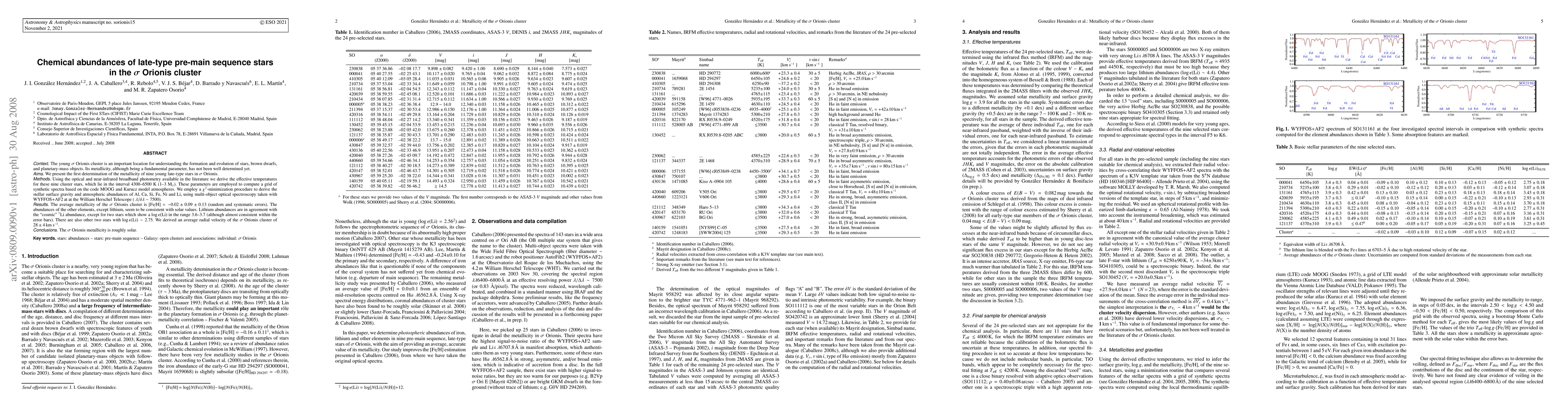The young $\sigma$-Orionis cluster is an important location for understanding the formation and evolution of stars, brown dwarfs, and planetary-mass objects. Its metallicity, although being a fundamental parameter, has not been well determined yet. We present the first determination of the metallicity of nine young late-type stars in $\sigma$-Orionis. Using the optical and near-infrared broadband photometry available in the literature we derive the effective temperatures for these nine cluster stars, which lie in the interval 4300--6500 K (1--3 \Msuno). These parameters are employed to compute a grid of synthetic spectra based on the code MOOG and Kurucz model atmospheres. We employ a $\chi^2$-minimization procedure to derive the stellar surface gravity and atmospheric abundances of Al, Ca, Si, Fe, Ni and Li, using multi-object optical spectroscopy taken with WYFFOS+AF2 at at the William Herschel Telescope ($\lambda/\delta\lambda\sim7500$). The average metallicity of the $\sigma$-Orionis cluster is [Fe/H] $ = -0.02\pm0.09\pm0.13$ (random and systematic errors). The abundances of the other elements, except lithium, seem to be consistent with solar values. Lithium abundances are in agreement with the "cosmic" $^7$Li abundance, except for two stars which show a $\log \epsilon(\mathrm{Li})$ in the range 3.6--3.7 (although almost consistent within the error bars). There are also other two stars with $\log \epsilon(\mathrm{Li})\sim 2.75$. We derived an average radial velocity of the $\sigma$-Orionis cluster of $28\pm4$km/s. The $\sigma$-Orionis metallicity is roughly solar.