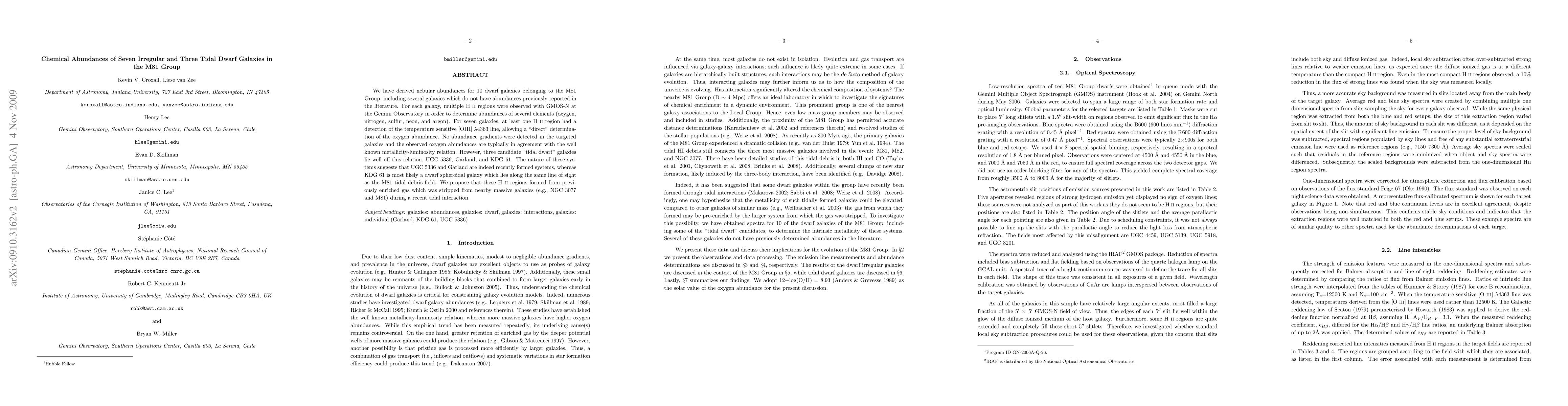 We have derived nebular abundances for 10 dwarf galaxies belonging to the M81 Group, including several galaxies which do not have abundances previously reported in the literature. For each galaxy, multiple H \ii regions were observed with GMOS-N at the Gemini Observatory in order to determine abundances of several elements (oxygen, nitrogen, sulfur, neon, and argon). For seven galaxies, at least one H \ii region had a detection of the temperature sensitive [OIII] $\lambda$4363 line, allowing a "direct" determination of the oxygen abundance. No abundance gradients were detected in the targeted galaxies and the observed oxygen abundances are typically in agreement with the well known metallicity-luminosity relation. However, three candidate "tidal dwarf" galaxies lie well off this relation, UGC 5336, Garland, and KDG 61. The nature of these systems suggests that UGC 5336 and Garland are indeed recently formed systems, whereas KDG 61 is most likely a dwarf spheroidal galaxy which lies along the same line of sight as the M81 tidal debris field. We propose that these H \ii regions formed from previously enriched gas which was stripped from nearby massive galaxies (e.g., NGC 3077 and M81) during a recent tidal interaction.