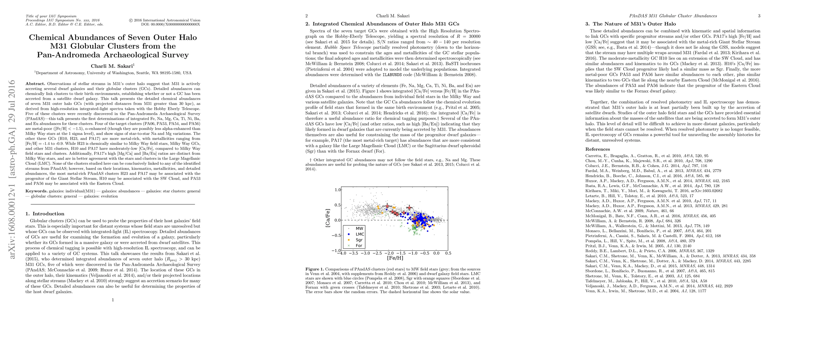 Observations of stellar streams in M31's outer halo suggest that M31 is actively accreting several dwarf galaxies and their globular clusters (GCs). Detailed abundances can chemically link clusters to their birth environments, establishing whether or not a GC has been accreted from a satellite dwarf galaxy. This talk presents the detailed chemical abundances of seven M31 outer halo GCs (with projected distances from M31 greater than 30 kpc), as derived from high-resolution integrated-light spectra taken with the Hobby Eberly Telescope. Five of these clusters were recently discovered in the Pan-Andromeda Archaeological Survey (PAndAS)---this talk presents the first determinations of integrated Fe, Na, Mg, Ca, Ti, Ni, Ba, and Eu abundances for these clusters. Four of the target clusters (PA06, PA53, PA54, and PA56) are metal-poor ($[\rm{Fe/H}] < -1.5$), $\alpha$-enhanced (though they are possibly less alpha-enhanced than Milky Way stars at the 1 sigma level), and show signs of star-to-star Na and Mg variations. The other three GCs (H10, H23, and PA17) are more metal-rich, with metallicities ranging from [Fe/H] = -1.4 to -0.9. While H23 is chemically similar to Milky Way field stars, Milky Way GCs, and other M31 clusters, H10 and PA17 have moderately-low [Ca/Fe], compared to Milky Way field stars and clusters. Additionally, PA17's high [Mg/Ca] and [Ba/Eu] ratios are distinct from Milky Way stars, and are in better agreement with the stars and clusters in the Large Magellanic Cloud (LMC). None of the clusters studied here can be conclusively linked to any of the identified streams from PAndAS; however, based on their locations, kinematics, metallicities, and detailed abundances, the most metal-rich PAndAS clusters H23 and PA17 may be associated with the progenitor of the Giant Stellar Stream, H10 may be associated with the SW Cloud, and PA53 and PA56 may be associated with the Eastern Cloud.