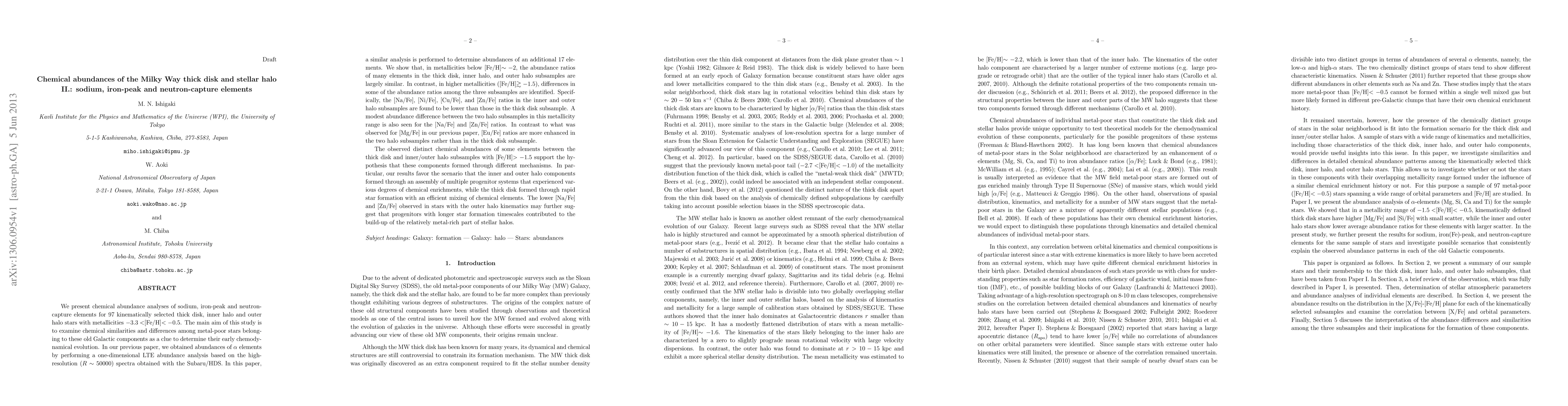 This study investigates the chemical abundances of sodium, iron-peak, and neutron-capture elements in 97 metal-poor stars from the Milky Way's thick disk, inner halo, and outer halo. It finds significant chemical similarities among these components at low metallicities but identifies distinct differences in higher metallicity regions, supporting different formation mechanisms for the thick disk versus the halos.