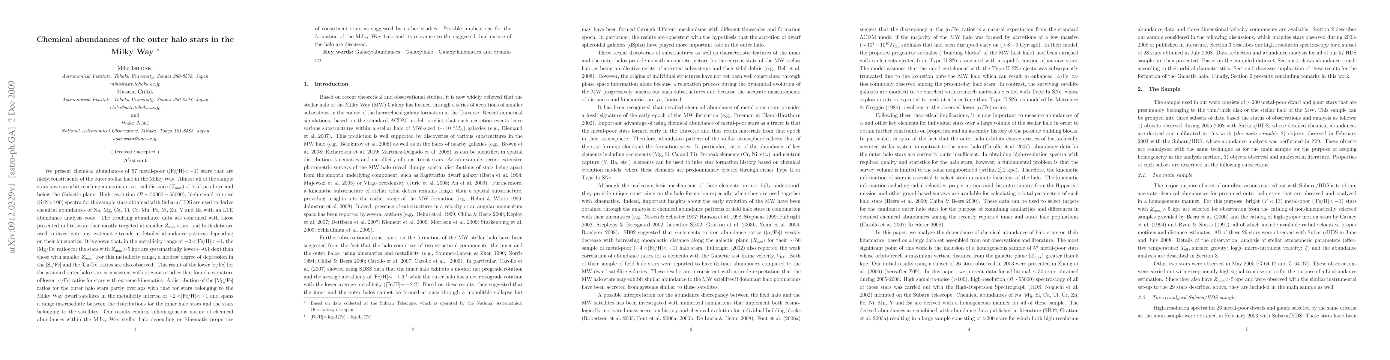 This study investigates the chemical abundances of 57 metal-poor stars in the Milky Way's outer halo, revealing lower [Mg/Fe] ratios for stars with extreme vertical kinematics compared to those with smaller vertical distances. The findings support the inhomogeneous nature of the Milky Way's stellar halo and suggest implications for its formation and dual nature.