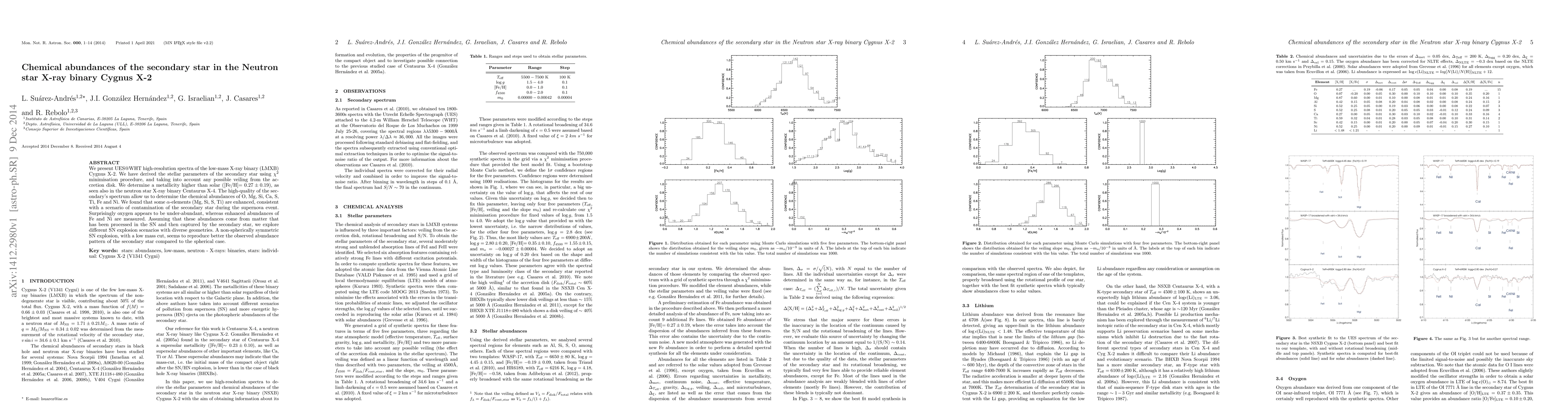 We present UES@WHT high-resolution spectra of the low-mass X-ray binary (LMXB) Cygnus X-2. We have derived the stellar parameters of the secondary star using $\chi^{2}$ minimisation procedure, and taking into account any possible veiling from the accretion disk. We determine a metallicity higher than solar ([Fe/H]$=0.27\pm0.19$), as seen also in the neutron star X-ray binary Centaurus X-4. The high-quality of the secondary's spectrum allow us to determine the chemical abundances of O, Mg, Si, Ca, S, Ti, Fe and Ni. We found that some $\alpha$-elements (Mg, Si, S, Ti) are enhanced, consistent with a scenario of contamination of the secondary star during the supernova event. Surprisingly oxygen appears to be under-abundant, whereas enhanced abundances of Fe and Ni are measured. Assuming that these abundances come from matter that has been processed in the SN and then captured by the secondary star, we explore different SN explosion scenarios with diverse geometries. A non-spherically symmetric SN explosion, with a low mass cut, seems to reproduce better the observed abundance pattern of the secondary star compared to the spherical case.