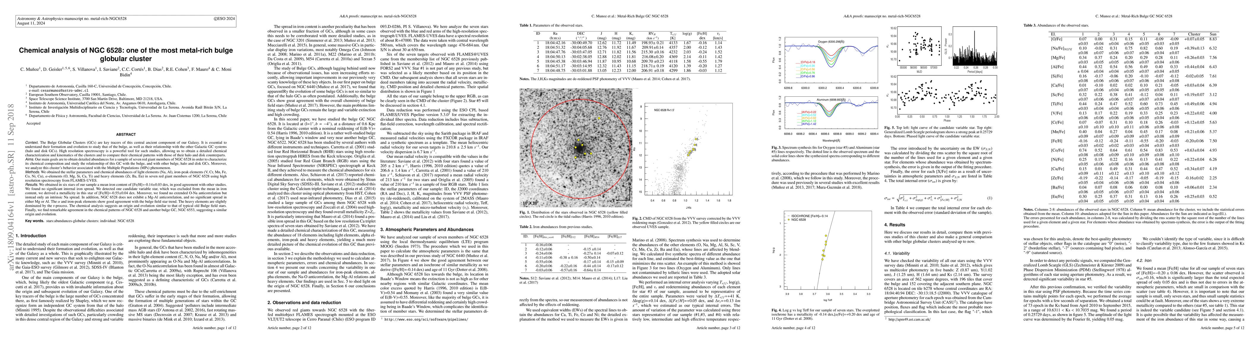 The Bulge Globular Clusters (GCs) are key tracers of this central ancient component of our Galaxy. It is essential to understand their formation and evolution to study that of the bulge, as well as their relationship with the other Galactic GC systems (halo and disk GCs). Our main goals are to obtain detailed abundances for a sample of seven red giant members of NGC 6528 in order to characterize its chemical composition and study the relationship of this GC with the bulge, and with other bulge, halo and disk GCs. Moreover, we analyze this cluster$'$s behavior associated with the Multiple Populations (MPs) phenomenon. We obtained the stellar parameters and chemical abundances of light elements (Na, Al), iron-peak elements (V, Cr, Mn, Fe, Co, Ni, Cu), {\alpha}-elements (O, Mg, Si, Ca, Ti) and heavy elements (Zr, Ba, Eu) in seven red giant members of NGC 6528 using high resolution spectroscopy from FLAMES-UVES. We obtained in six stars of our sample a mean iron content of [Fe/H]=-0.14+/-0.03 dex, in good agreement with other studies. We found no significant internal iron spread. We detected one candidate variable star, which was excluded from the mean in iron content, we derived a metallicity in this star of [Fe/H]=-0.55+/-0.04 dex. Moreover, we found no extended O-Na anticorrelation but instead only an intrinsic Na spread. In addition, NGC 6528 does not exhibit a Mg-Al anticorrelation, and no significant spread in either Mg or Al. The {\alpha} and iron-peak elements show good agreement with the bulge field star trend. The heavy elements are slightly dominated by the r-process. The chemical analysis suggests an origin and evolution similar to that of typical old Bulge field stars. Finally, we find remarkable agreement in the chemical patterns of NGC 6528 and another bulge GC, NGC 6553, suggesting a similar origin and evolution.