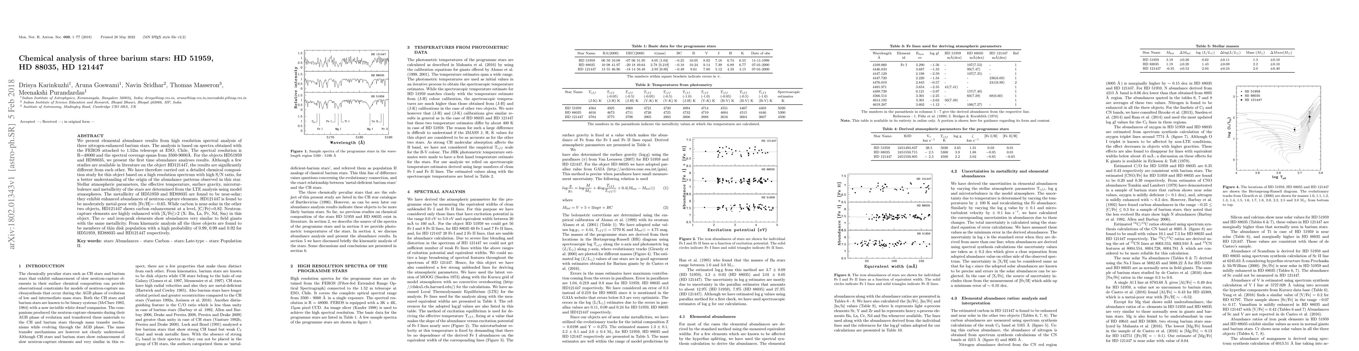 This study analyzes three barium stars (HD 51959, HD 88035, HD 121447) using high-resolution spectra from the FEROS telescope in Chile. It finds HD 51959 and HD 88035 to have near-solar metallicity and enhanced neutron-capture elements. HD 121447 is moderately metal-poor with near-solar carbon and significantly enhanced neutron-capture elements. All three are identified as thin disk members. The research determines stellar parameters via LTE analysis of model atmospheres.