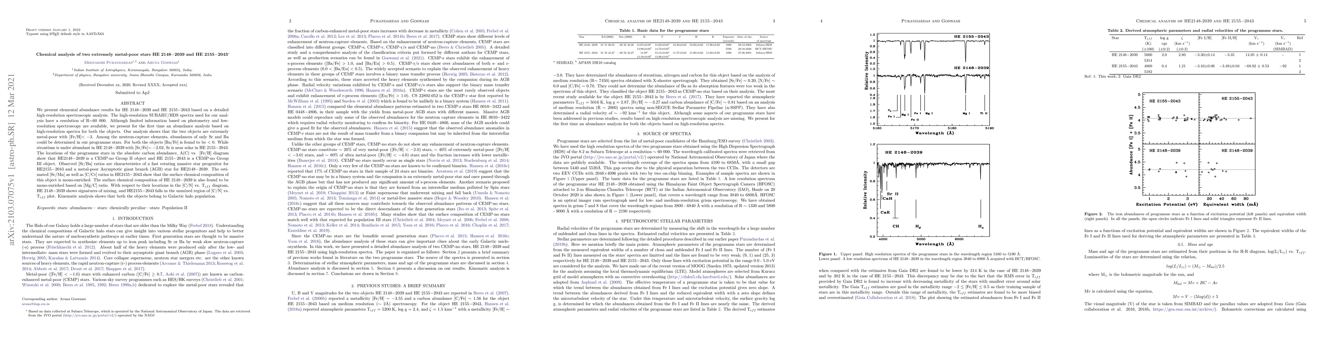 We present elemental abundance results for HE 2148-2039 and HE 2155-2043 based on a detailed high-resolution spectroscopic analysis. The high-resolution SUBARU/HDS spectra used for our analysis have a resolution of R~60 000. Although limited information based on photometry and low-resolution spectroscopy are available, we present for the first time an abundance analysis based on high-resolution spectra for both the objects. Our analysis shows that the two objects are extremely metal-poor with [Fe/H]< -3. Among the neutron-capture elements, abundances of only Sr and Ba could be determined in our programme stars. For both the objects [Ba/Fe] is found to be < 0. While strontium is under abundant in HE 2148-2039 with [Sr/Fe]~ -2.02, Sr is near solar in HE 2155-2043. The locations of the programme stars in the absolute carbon abundance, A(C) vs. [Fe/H] diagram show that HE 2148-2039 is a CEMP-no Group II object and HE 2155-2043 is a CEMP-no Group III object. Observed [Sr/Ba] ratios are characteristics of a fast rotating massive star progenitor for HE 2155-2043 and a metal-poor Asymptotic giant branch (AGB) star for HE 2148-2039. The estimated [Sc/Mn] as well as [C/Cr] ratios in HE 2155-2043 show that the surface chemical composition of this object is mono-enriched. The surface chemical composition of HE 2148-2039 is also found to be mono-enriched based on [Mg/C] ratio. With respect to their locations in the [C/N] vs. T eff diagram, HE 2148-2039 shows signatures of mixing, and HE 2155-2043 falls in the unmixed region of [C/N] vs. Teff plot. Kinematic analysis shows that both the objects belong to Galactic halo population.