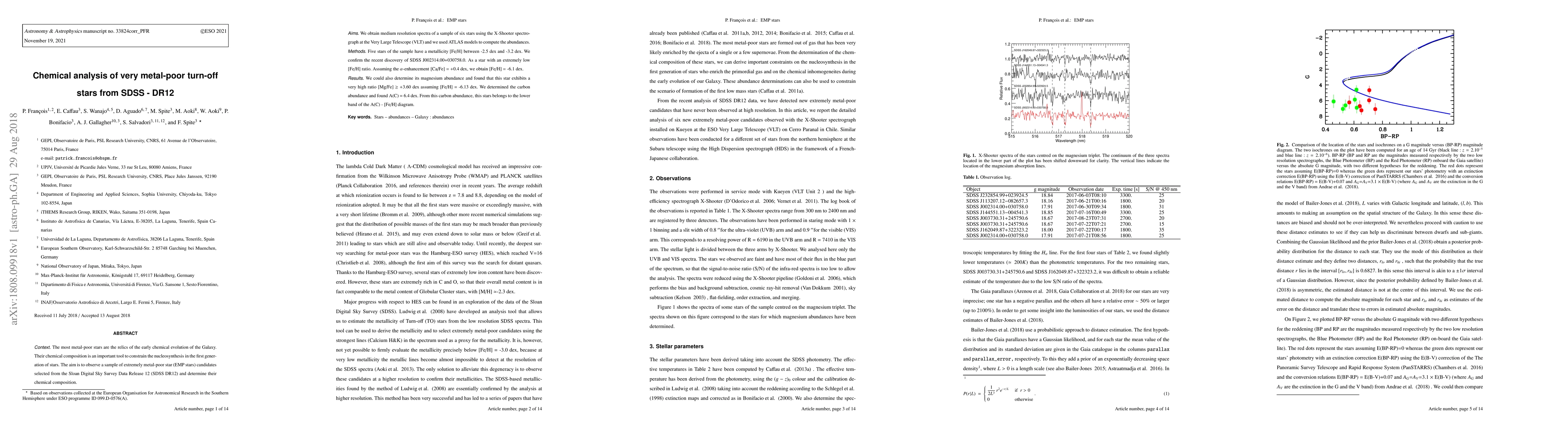 Researchers analyzed six extremely metal-poor stars from SDSS-DR12 to determine their chemical composition, finding one star with a record-low iron abundance and high magnesium ratio.
