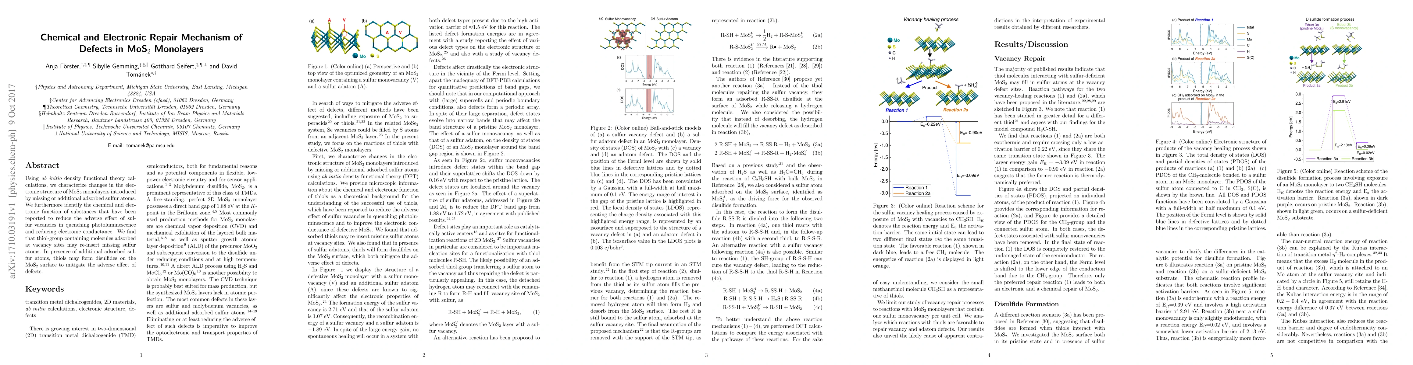 Using {\em ab initio} density functional theory calculations, we characterize changes in the electronic structure of MoS$_{2}$ monolayers introduced by missing or additional adsorbed sulfur atoms. We furthermore identify the chemical and electronic function of substances that have been reported to reduce the adverse effect of sulfur vacancies in quenching photoluminescence and reducing electronic conductance. We find that thiol-group containing molecules adsorbed at vacancy sites may re-insert missing sulfur atoms. In presence of additional adsorbed sulfur atoms, thiols may form disulfides on the MoS$_{2}$ surface to mitigate the adverse effect of defects.