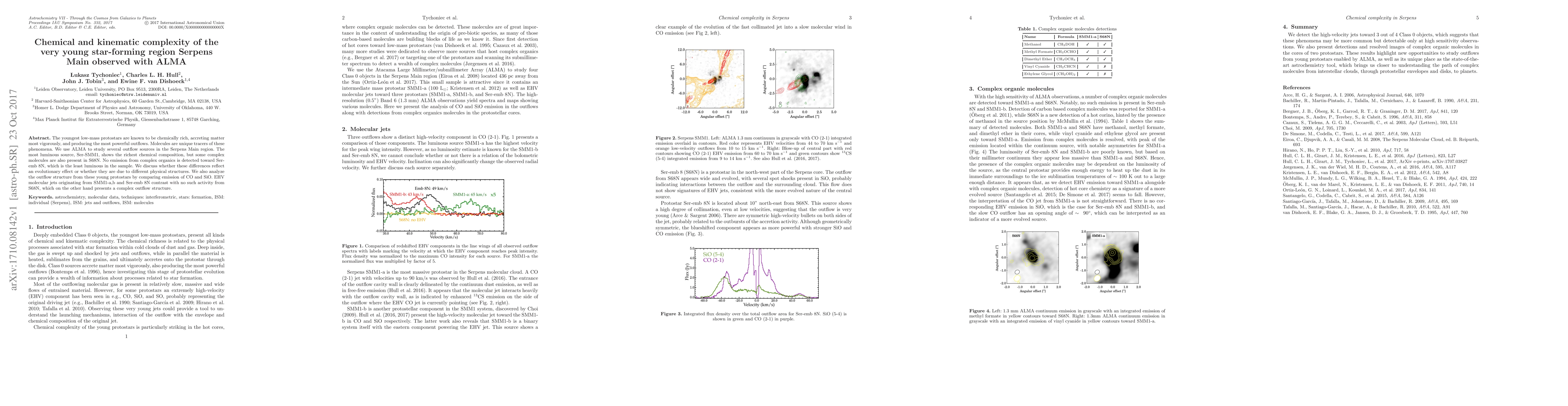 The youngest low-mass protostars are known to be chemically rich, accreting matter most vigorously, and producing the most powerful outflows. Molecules are unique tracers of these phenomena. We use ALMA to study several outflow sources in the Serpens Main region. The most luminous source, Ser-SMM1, shows the richest chemical composition, but some complex molecules are also present in S68N. No emission from complex organics is detected toward Ser-emb 8N, which is the least luminous in the sample. We discuss whether these differences reflect an evolutionary effect or whether they are due to different physical structures. We also analyze the outflow structure from these young protostars by comparing emission of CO and SiO. EHV molecular jets originating from SMM1-a,b and Ser-emb 8N contrast with no such activity from S68N, which on the other hand presents a complex outflow structure.
