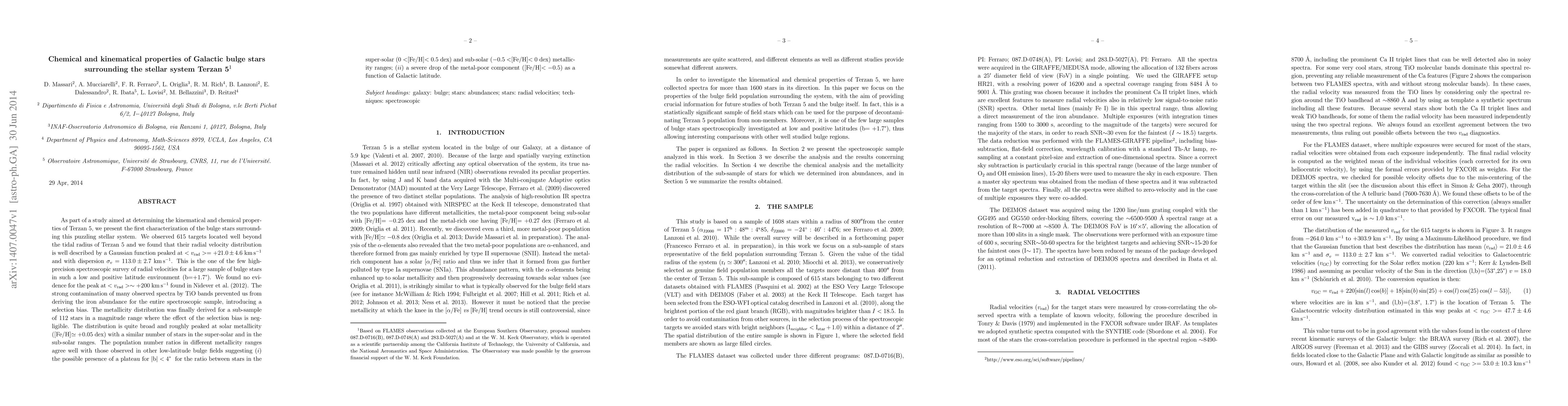 Researchers studied 615 bulge stars surrounding Terzan 5, finding a peak radial velocity of +21 km/s and metallicity distribution peaking at solar metallicity, with no evidence for a previously reported high-velocity peak.