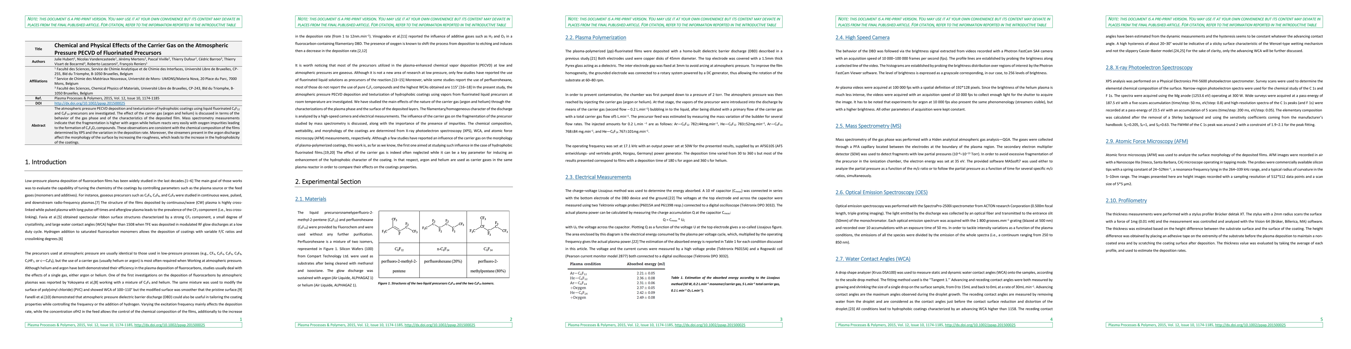 Researchers investigated the effects of carrier gas (argon and helium) on PECVD deposition of hydrophobic coatings, finding that argon led to higher fragmentation and increased roughness, enhancing coating hydrophobicity.