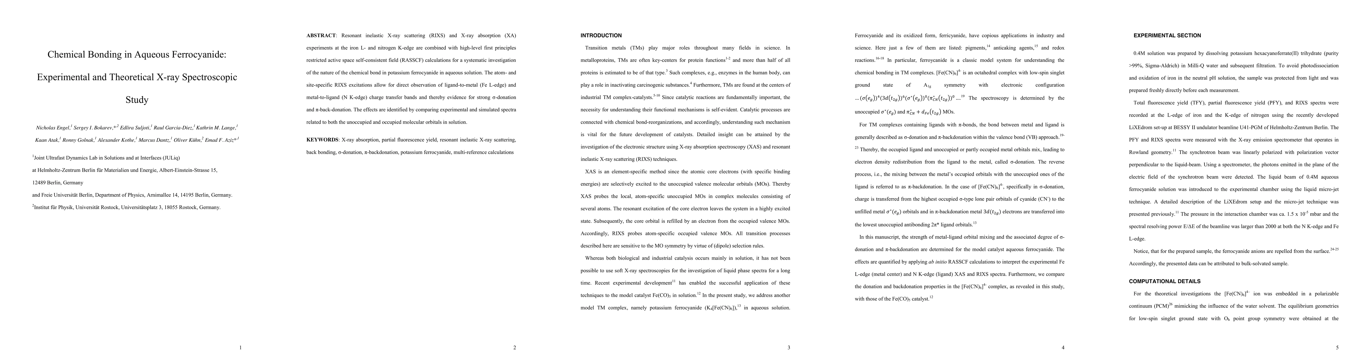 Resonant inelastic X-ray scattering (RIXS) and X-ray absorption (XA) experiments at the iron L- and nitrogen K-edge are combined with high-level first principles restricted active space self-consistent field (RASSCF) calculations for a systematic investigation of the nature of the chemical bond in potassium ferrocyanide in aqueous solution. The atom- and site-specific RIXS excitations allow for direct observation of ligand-to-metal (Fe L-edge) and metal-to-ligand (N K-edge) charge transfer bands and thereby evidence for strong {\sigma}-donation and {\pi}-back-donation. The effects are identified by comparing experimental and simulated spectra related to both the unoccupied and occupied molecular orbitals in solution.