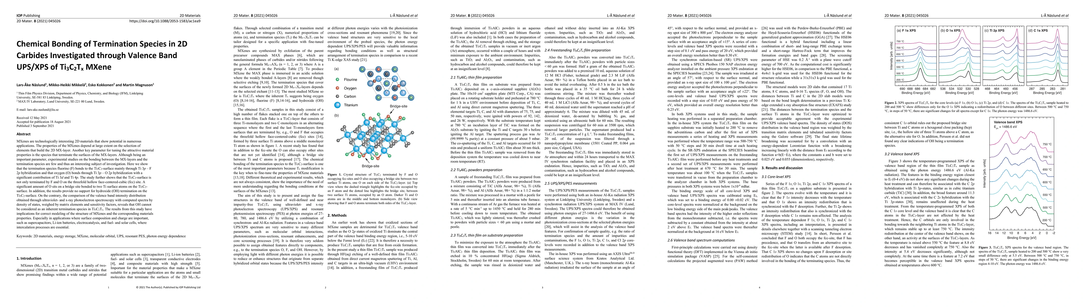 MXenes are technologically interesting 2D materials that show potential in numerous applications. The properties of the MXenes depend at large extent on the selection of elements that build the 2D MX-layer. Another key parameter for tuning the attractive material properties is the species that terminate the surfaces of the MX-layers. Although being an important parameter, experimental studies on the bonding between the MX-layers and the termination species are few and thus an interesting subject of investigation. Here we show that the termination species fluorine (F) bonds to the Ti3C2-surface mainly through Ti 3p - F 2p hybridization and that oxygen (O) bonds through Ti 3p - O 2p hybridization with a significant contribution of Ti 3d and Ti 4p. The study further shows that the Ti3C2-surface is not only terminated by F and O on the threefold hollow face-centered-cubic (fcc) site. A significant amount of O sits on a bridge site bonded to two Ti surface atoms on the Ti3C2-surface. In addition, the results provide no support for hydroxide (OH) termination on the Ti3C2-surface. On the contrary, the comparison of the valence band intensity distribution obtained through ultraviolet- and x-ray photoelectron spectroscopy with computed spectra by density of states, weighed by matrix elements and sensitivity factors, reveals that OH cannot be considered as an inherent termination species in Ti3C2Tx. The results from this study have implications for correct modeling of the structure of MXenes and the corresponding materials properties. Especially in applications where surface composition and charge are important, such as supercapacitors, Li-ion batteries, electrocatalysis, and fuel- and solar cells, where intercalation processes are essential.