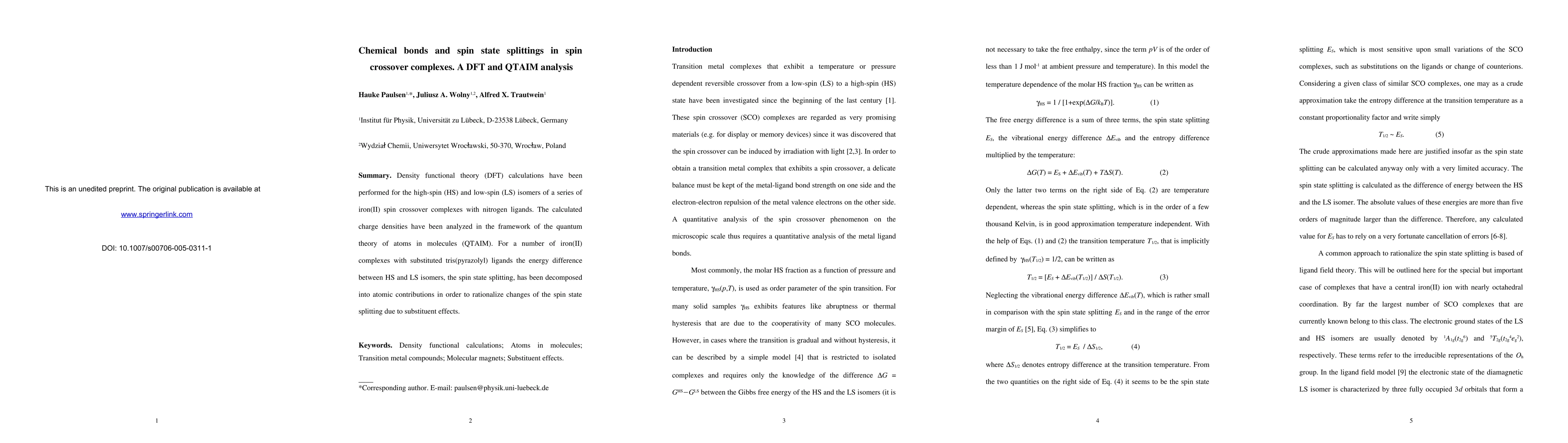 This paper uses DFT calculations and QTAIM analysis to investigate the chemical bonds and spin state splittings in iron(II) spin crossover complexes. The study decomposes the energy difference between high-spin and low-spin isomers to understand the impact of substituent effects on spin state transitions.
