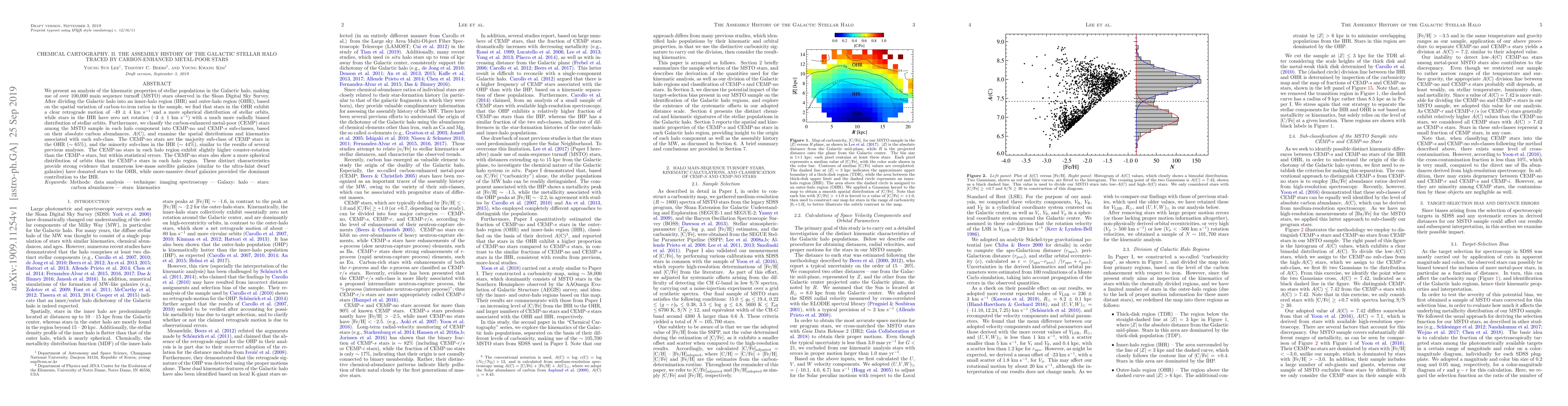 This paper analyzes the kinematic properties of Galactic halo stars, revealing distinct behaviors between inner and outer halo regions. Stars in the outer halo show retrograde motion and a spherical orbit distribution, while those in the inner halo have zero net rotation and more radial orbits. Carbon-enhanced metal-poor stars are classified into CEMP-no and CEMP-$s$ sub-classes, with CEMP-no stars dominating the outer halo and suggesting contributions from low-mass satellite galaxies.