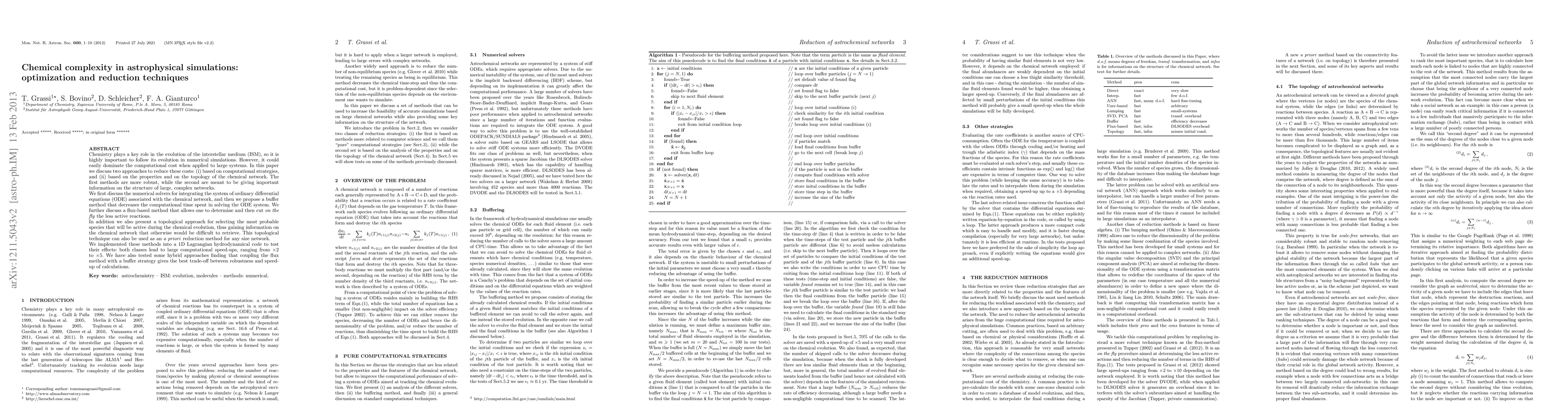 Chemistry has a key role in the evolution of the interstellar medium (ISM), so it is highly desirable to follow its evolution in numerical simulations. However, it may easily dominate the computational cost when applied to large systems. In this paper we discuss two approaches to reduce these costs: (i) based on computational strategies, and (ii) based on the properties and on the topology of the chemical network. The first methods are more robust, while the second are meant to be giving important information on the structure of large, complex networks. To this aim we first discuss the numerical solvers for integrating the system of ordinary differential equations (ODE) associated with the chemical network. We then propose a buffer method that decreases the computational time spent in solving the ODE system. We further discuss a flux-based method that allows one to determine and then cut on the fly the less active reactions. In addition we also present a topological approach for selecting the most probable species that will be active during the chemical evolution, thus gaining information on the chemical network that otherwise would be difficult to retrieve. This topological technique can also be used as an a priori reduction method for any size network. We implemented these methods into a 1D Lagrangian hydrodynamical code to test their effects: both classes lead to large computational speed-ups, ranging from x2 to x5. We have also tested some hybrid approaches finding that coupling the flux method with a buffer strategy gives the best trade-off between robustness and speed-up of calculations.