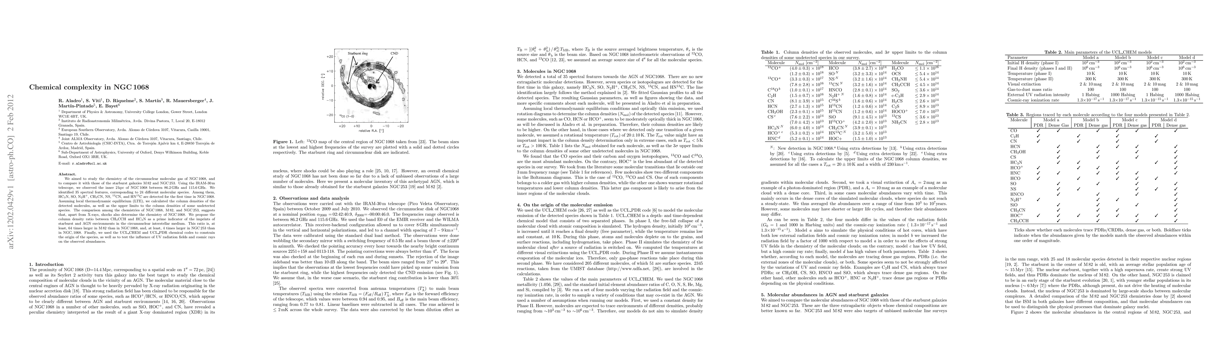 We aimed to study the chemistry of the circumnuclear molecular gas of NGC1068, and to compare it with those of the starburst galaxies M82 and NGC253. Using the IRAM-30m telescope, we observed the inner 2 kpc of NGC1068 between 86.2 GHz and 115.6 GHz. We identified 35 spectral features, corresponding to 24 different molecular species. Among them, HC3N, SO, N2H+, CH3CN, NS, 13CN, and HN13C are detected for the first time in NGC1068. Assuming local thermodynamic equilibrium (LTE), we calculated the column densities of the detected molecules, as well as the upper limits to the column densities of some undetected species. The comparison among the chemistries of NGC1068, M82, and NGC253, suggests that, apart from X-rays, shocks also determine the chemistry of NGC1068. We propose the column density ratio between CH3CCH and HC3N as a prime indicator of the imprints of starburst and AGN environments in the circumnuclear interstellar medium. This ratio is, at least, 64 times larger in M82 than in NGC1068, and, at least, 4 times larger in NGC253 than in NGC1068. Finally, we used the UCL_CHEM and UCL_PDR chemical codes to constrain the origin of the species, as well as to test the influence of UV radiation fields and cosmic rays on the observed abundances.