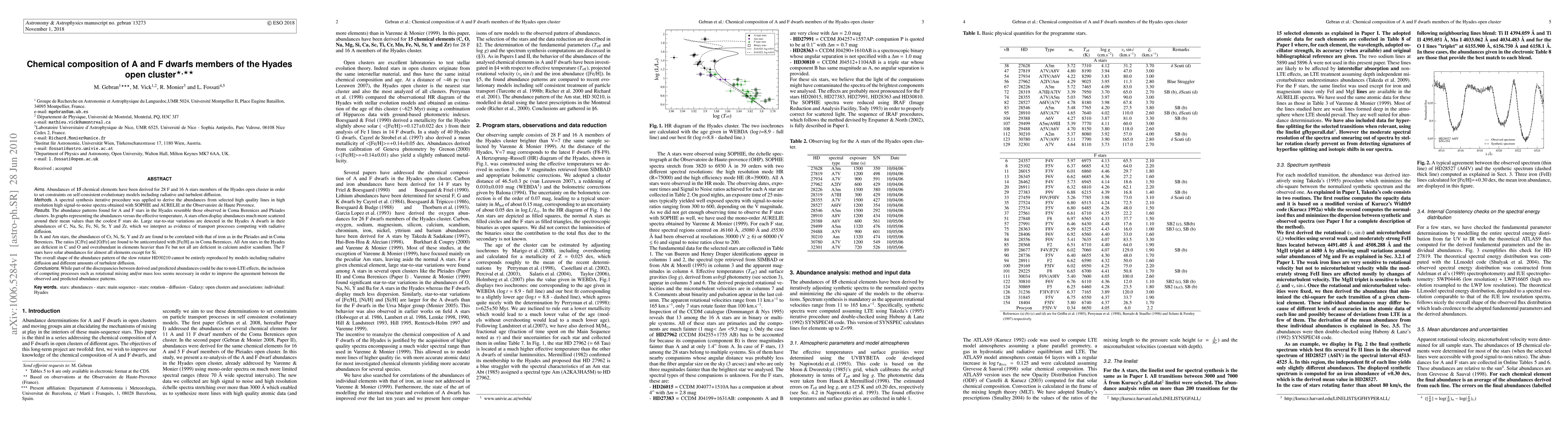 This study derives the abundances of 15 chemical elements for 28 F and 16 A stars in the Hyades cluster, revealing significant star-to-star variations in A stars, especially in elements like C, Na, and Fe, suggesting complex transport processes. The abundance patterns of F stars are mostly solar, with notable discrepancies in Si, indicating the need for models including turbulent diffusion and rotational mixing.