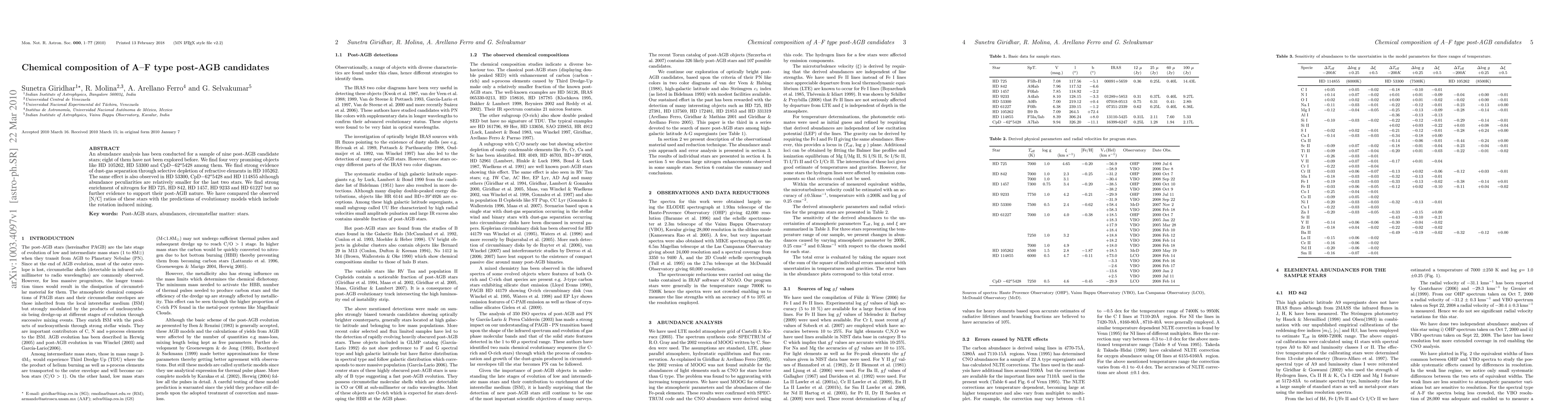 An abundance analysis has been conducted for a sample of nine post-AGB candidate stars; eight of them have not been explored before. We find four very promising objects like HD 105262, HD 53300 and CpD$-62^o5428$ among them. We find strong evidence of dust-gas separation through selective depletion of refractive elements in HD 105262. The same effect is also observed in HD 53300, CpD$-62^o5428$ and HD 114855 although abundance peculiarities are relatively smaller for the last two stars. We find strong enrichment of nitrogen for HD 725, HD 842, HD 1457, HD 9233 and HD 61227 but no further evidence to support their post-AGB nature. We have compared the observed [N/C] ratios of these stars with the predictions of evolutionary models which include the rotation induced mixing.