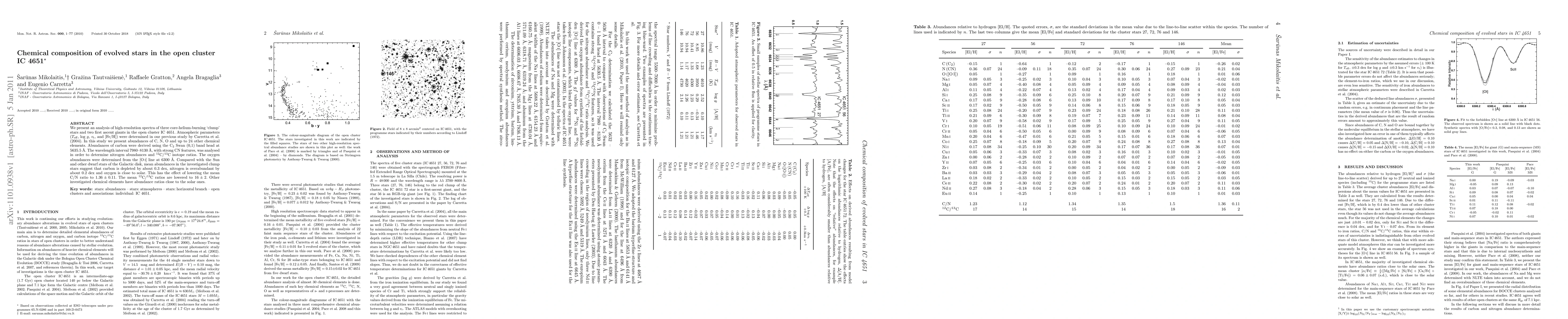 This study analyzes high-resolution spectra of evolved stars in the open cluster IC 4651, revealing carbon depletion, nitrogen overabundance, and oxygen near solar levels. The findings suggest a mean C/N ratio of 1.36 ± 0.11 and 12^C/13^C ratios of 16 ± 2, with most other elements showing solar-like abundances.