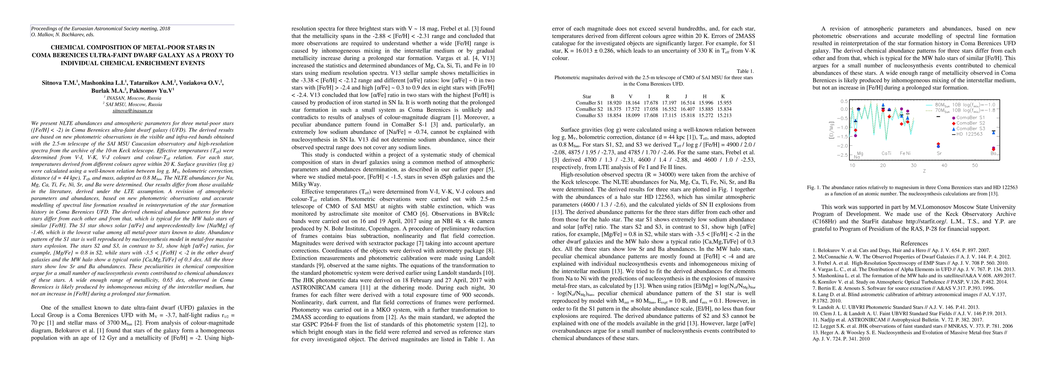 We present NLTE abundances and atmospheric parameters for three metal-poor stars ([Fe/H]<-2) in Coma Berenices ultra-faint dwarf galaxy (UFD). The derived results are based on new photometric observations obtained with the 2.5-m telescope of the SAI MSU Caucasian observatory and spectra from the archive of the 10-m Keck telescope. Effective temperatures were determined from V-I, V-K, V-J colours. For each star, Teffs derived from different colours agree within 20K. Surface gravities (log g) were calculated using a relation between log g, MV, BC, distance, Teff, and mass, adopted as 0.8MSun. The NLTE abundances for Na, Mg, Ca, Ti, Fe, Ni, Sr, and Ba were determined. A revision of atmospheric parameters and abundances, based on new photometric observations and accurate modelling of spectral line formation resulted in reinterpretation of the star formation history in Coma Berenices UFD. The derived chemical abundance patterns for three stars differ from each other and from that, which is typical for the MW halo stars of similar [Fe/H]. The S1 star shows solar [alpha/Fe] and unprecedentedly low [Na/Mg] of -1.46, which is the lowest value among metal-poor stars known to date. Abundance pattern of the S1 star is well reproduced by nucleosynthesis model in metal-free massive stars explosion. The stars S2 and S3, in contrast to S1, show high [alpha/Fe] ratios, for example, [Mg/Fe]=0.8 in S2, while stars with -3.5<[Fe/H]<-2 in the other dwarf galaxies and the MW show a typical ratio [Ca,Mg/Fe] of 0.3 dex. All the three stars show low Sr and Ba abundances. These peculiarities in chemical composition argue for a small number of nucleosynthesis events contributed to chemical abundances of these stars. A wide range of metallicity, 0.65 dex, observed in Coma Berenices is likely produced by inhomogeneous mixing of the interstellar medium, but not an increase in [Fe/H] during a prolonged star formation.