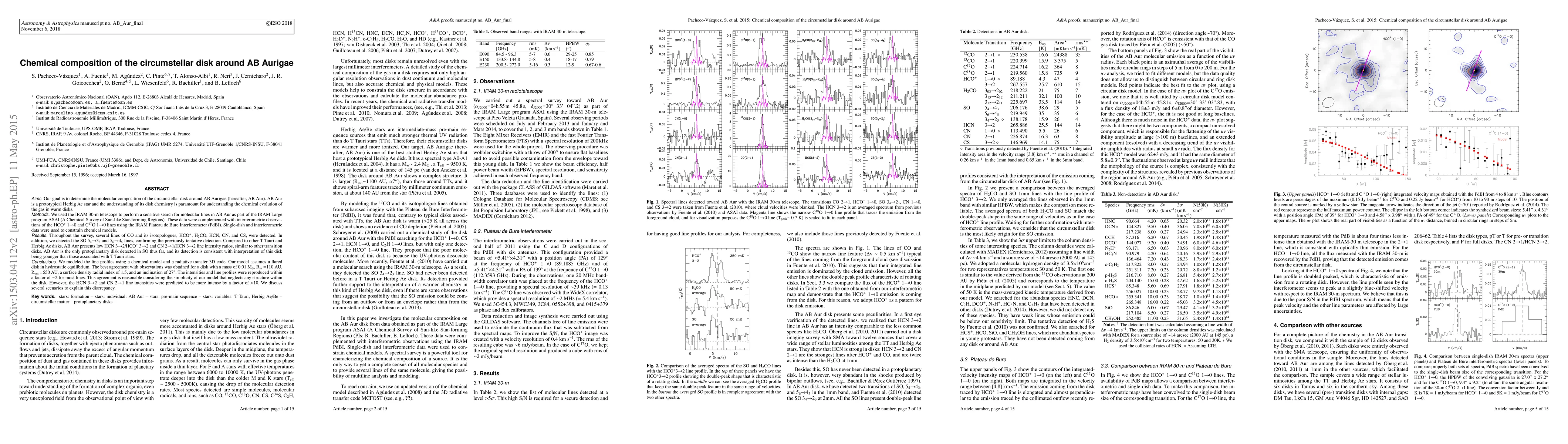 This study analyzed the chemical composition of AB Aurigae's circumstellar disk, detecting several molecular lines including CO, HCN, CN, and CS. The modelled disk parameters suggest a flared disk in hydrostatic equilibrium, with a mass of 0.01 Msun and an inclination of 27 degrees.