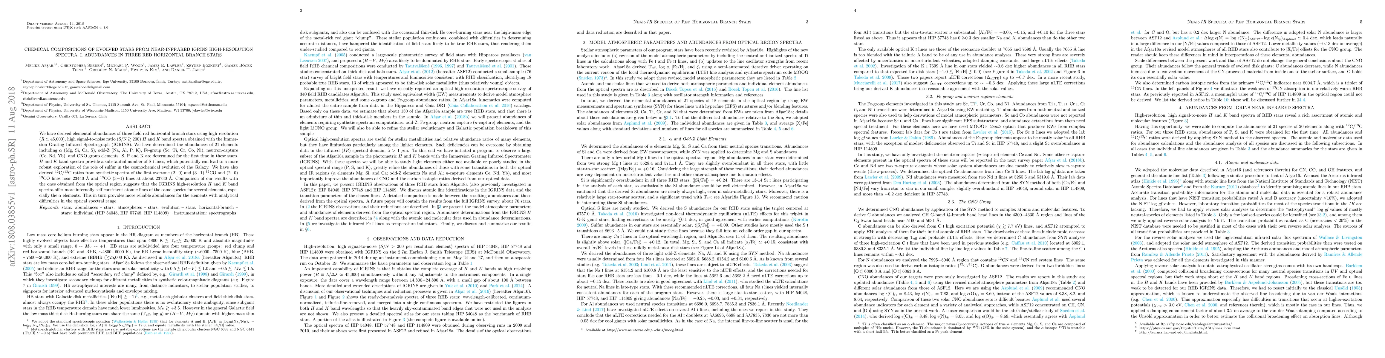 We have derived elemental abundances of three field red horizontal branch stars using high-resolution (R$\simeq$ 45,000), high signal-to-noise ratio (S/N $\gtrsim$ 200) $H$ and $K$ band spectra obtained with the Immersion Grating Infrared Spectrograph (IGRINS). We have determined the abundances of 21 elements including $\alpha$ (Mg, Si, Ca, S), odd-Z (Na, Al, P, K), Fe-group (Sc, Ti, Cr, Co, Ni), neutron-capture (Ce, Nd, Yb), and CNO group elements. S, P and K are determined for the first time in these stars. $H$ and $K$ band spectra provide a substantial number of S I lines, which potentially can lead to a more robust exploration of the role of sulfur in the cosmochemical evolution of the Galaxy. We have also derived $^{12}$C/$^{13}$C ratios from synthetic spectra of the first overtone (2$-$0) and (3$-$1) $^{12}$CO and (2$-$0) $^{13}$CO lines near 23440 \AA\ and $^{13}$CO (3$-$1) lines at about 23730 \AA. Comparison of our results with the ones obtained from the optical region suggests that the IGRINS high-resolution $H$ and $K$ band spectra offer more internally self-consistent atomic lines of the same species for several elements, especially the $\alpha$ elements. This in turn provides more reliable abundances for the elements with analytical difficulties in the optical spectral range.