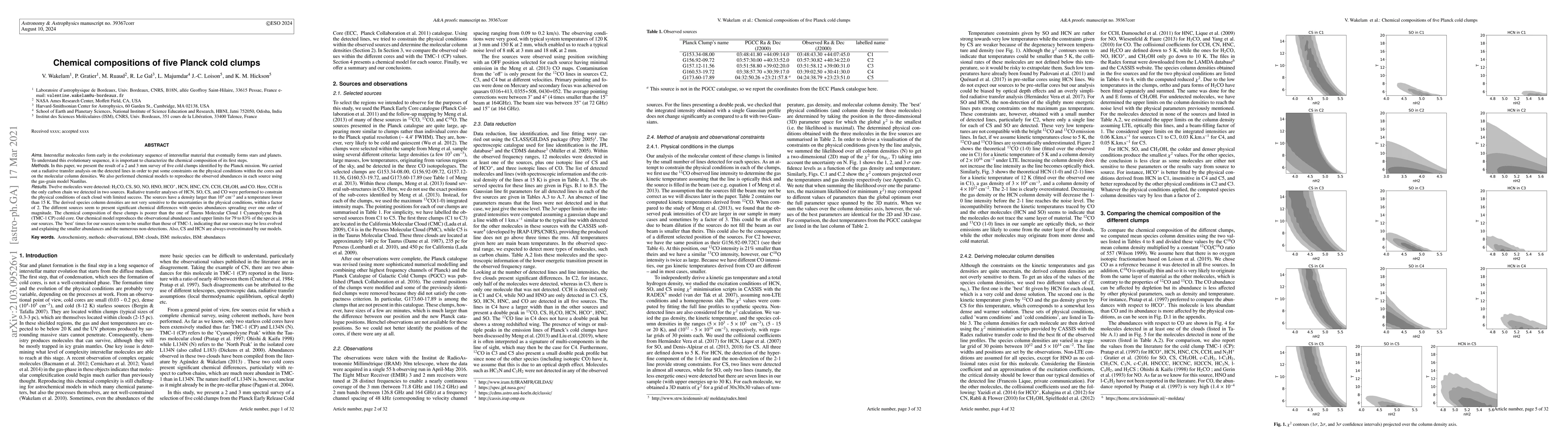 Aims: Interstellar molecules form early in the evolutionary sequence of interstellar material that eventually forms stars and planets. To understand this evolutionary sequence, it is important to characterize the chemical composition of its first steps. Methods: In this paper, we present the result of a 2 and 3 mm survey of five cold clumps identified by the Planck mission. We carried out a radiative transfer analysis on the detected lines in order to put some constraints on the physical conditions within the cores and on the molecular column densities. We also performed chemical models to reproduce the observed abundances in each source using the gas-grain model Nautilus. Results: Twelve molecules were detected: H2CO, CS, SO, NO, HNO, HCO+, HCN, HNC, CN, CCH, CH3OH, and CO. Here, CCH is the only carbon chain we detected in two sources. Radiative transfer analyses of HCN, SO, CS, and CO were performed to constrain the physical conditions of each cloud with limited success. The sources have a density larger than $10^4$ cm$^{-3}$ and a temperature lower than 15 K. The derived species column densities are not very sensitive to the uncertainties in the physical conditions, within a factor of 2. The different sources seem to present significant chemical differences with species abundances spreading over one order of magnitude. The chemical composition of these clumps is poorer than the one of Taurus Molecular Cloud 1 Cyanopolyyne Peak (TMC-1 CP) cold core. Our chemical model reproduces the observational abundances and upper limits for 79 to 83\% of the species in our sources. The "best" times for our sources seem to be smaller than those of TMC-1, indicating that our sources may be less evolved and explaining the smaller abundances and the numerous non-detections. Also, CS and HCN are always overestimated by our models.