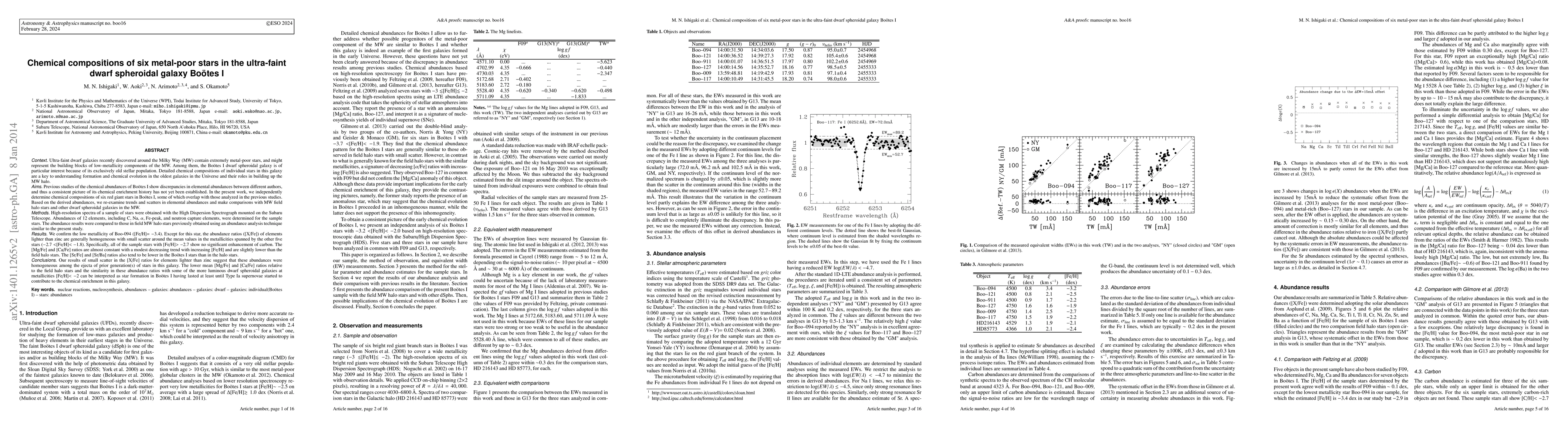 This study analyzes the chemical compositions of six metal-poor stars in the ultra-faint dwarf galaxy Boötes I, revealing low metallicity and homogeneous abundance ratios for elements lighter than zinc, suggesting a uniform distribution of ejecta from earlier stellar generations. The findings indicate a slight difference in Mg, Ca, Sr, and Ba ratios compared to Milky Way halo stars.