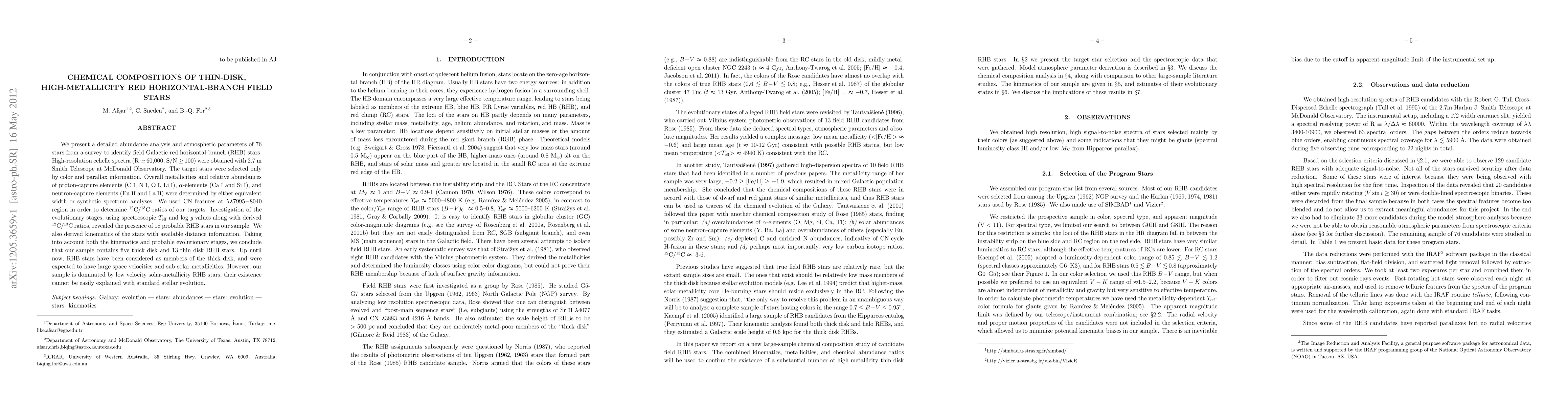 We present a detailed abundance analysis and atmospheric parameters of 76 stars from a survey to identify field Galactic red horizontal-branch (RHB) stars. High-resolution echelle spectra (R\simeq60,000, S/N>=100) were obtained with 2.7 m Smith Telescope at McDonald Observatory. The target stars were selected only by color and parallax information. Overall metallicities and relative abundances of proton-capture elements (C I, N I, O I, Li I), alpha-elements (Ca I and Si I), and neutron-capture elements (Eu II and La II) were determined by either equivalent width or synthetic spectrum analyses. We used CN features at 7995-8040 {\AA} region in order to determine 12^C/13^C ratios of our targets. Investigation of the evolutionary stages, using spectroscopic T_eff and log g values along with derived 12^C/13^C ratios, revealed the presence of 18 probable RHB stars in our sample. We also derived kinematics of the stars with available distance information. Taking into account both the kinematics and probable evolutionary stages, we conclude that our sample contains five thick disk and 13 thin disk RHB stars. Up until now, RHB stars have been considered as members of the thick disk, and were expected to have large space velocities and sub-solar metallicities. However, our sample is dominated by low velocity solar-metallicity RHB stars; their existence cannot be easily explained with standard stellar evolution.