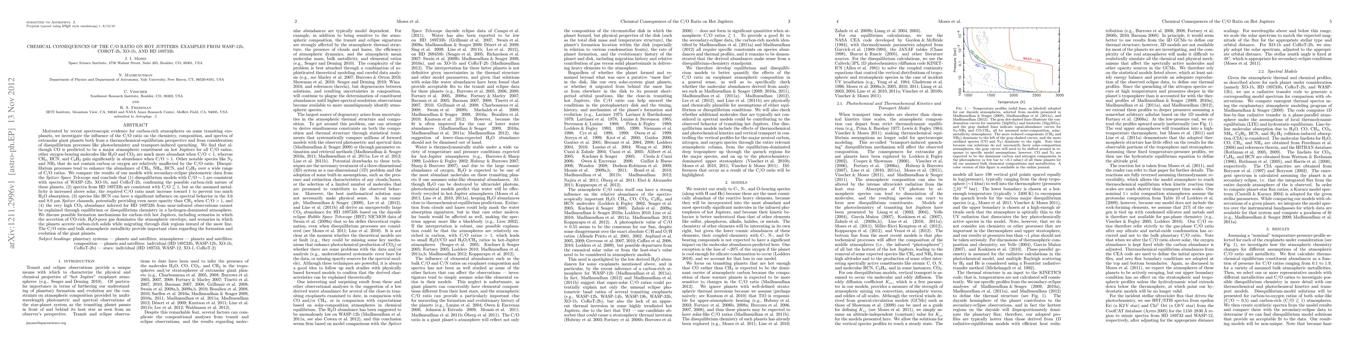 Motivated by recent spectroscopic evidence for carbon-rich atmospheres on some transiting exoplanets, we investigate the influence of the C/O ratio on the chemistry, composition, and spectra of extrasolar giant planets both from a thermochemical-equilibrium perspective and from consideration of disequilibrium processes like photochemistry and transport-induced quenching. We find that although CO is predicted to be a major atmospheric constituent on hot Jupiters for all C/O ratios, other oxygen-bearing molecules like H2O and CO2 are much more abundant when C/O < 1, whereas CH4, HCN, and C2H2 gain significantly in abundance when C/O > 1. Disequilibrium processes tend to enhance the abundance of CH4, NH3, HCN, and C2H2 over a wide range of C/O ratios. We compare the results of our models with secondary-eclipse photometric data from the Spitzer Space Telescope and conclude that (1) disequilibrium models with C/O ~ 1 are consistent with spectra of WASP-12b, XO-1b, and CoRoT-2b, confirming the possible carbon-rich nature of these planets, (2) spectra from HD 189733b are consistent with C/O ~< 1, but as the assumed metallicity is increased above solar, the required C/O ratio must increase toward 1 to prevent too much H2O absorption, (3) species like HCN can have a significant influence on spectral behavior in the 3.6 and 8.0 um Spitzer channels, potentially providing even more opacity than CH4 when C/O > 1, and (4) the very high CO2 abundance inferred for HD 189733b from near-infrared observations cannot be explained through equilibrium or disequilibrium chemistry in a H2-dominated atmosphere. We discuss possible formation mechanisms for carbon-rich hot Jupiters. The C/O ratio and bulk atmospheric metallicity provide important clues regarding the formation and evolution of the giant planets.