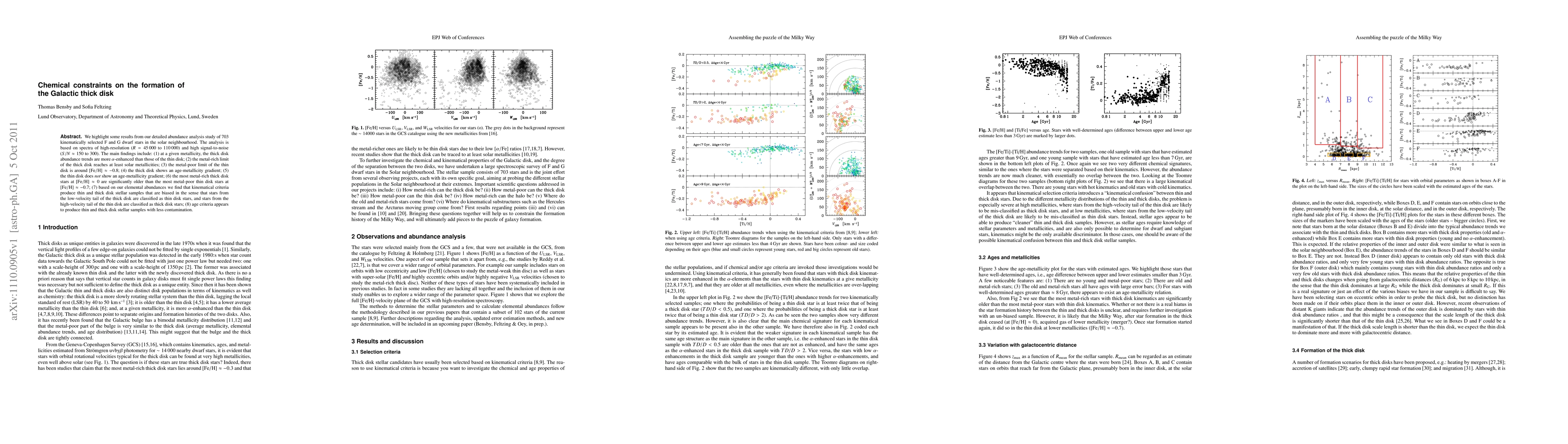 We highlight some results from our detailed abundance analysis study of 703 kinematically selected F and G dwarf stars in the solar neighbourhood. The analysis is based on spectra of high-resolution (R=45000 to 110000) and high signal-to-noise (S/N=150 to 300). The main findings include: (1) at a given metallicity, the thick disk abundance trends are more $\alpha$-enhanced than those of the thin disk; (2) the metal-rich limit of the thick disk reaches at least solar metallicities; (3) the metal-poor limit of the thin disk is around [Fe/H]=-0.8; (4) the thick disk shows an age-metallicity gradient; (5) the thin disk does {\it not} show an age-metallicity gradient; (6) the most metal-rich thick disk stars at [Fe/H]=0 are significantly older than the most metal-poor thin disk stars at [Fe/H]=-0.7; (7) based on our elemental abundances we find that kinematical criteria produce thin and thick disk stellar samples that are biased in the sense that stars from the low-velocity tail of the thick disk are classified as thin disk stars, and stars from the high-velocity tail of the thin disk are classified as thick disk stars; (8) age criteria appears to produce thin and thick disk stellar samples with less contamination.
