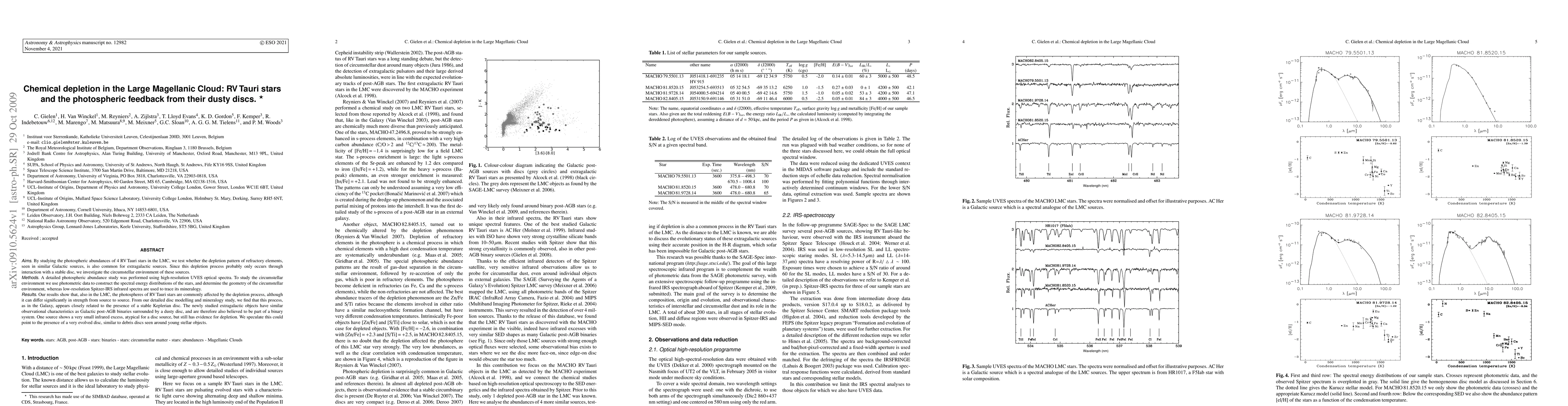 Aims: By studying the photospheric abundances of 4 RV Tauri stars in the LMC, we test whether the depletion pattern of refractory elements, seen in similar Galactic sources, is also common for extragalactic sources. Since this depletion process probably only occurs through interaction with a stable disc, we investigate the circumstellar environment of these sources. Methods: A detailed photospheric abundance study was performed using high-resolution UVES optical spectra. To study the circumstellar environment we use photometric data to construct the spectral energy distributions of the stars, and determine the geometry of the circumstellar environment, whereas low-resolution Spitzer-IRS infrared spectra are used to trace its mineralogy. Results: Our results show that, also in the LMC, the photospheres of RV Tauri stars are commonly affected by the depletion process, although it can differ significantly in strength from source to source. From our detailed disc modelling and mineralogy study, we find that this process, as in the Galaxy, appears closely related to the presence of a stable Keplerian disc. The newly studied extragalactic objects have similar observational characteristics as Galactic post-AGB binaries surrounded by a dusty disc, and are therefore also believed to be part of a binary system. One source shows a very small infrared excess, atypical for a disc source, but still has evidence for depletion. We speculate this could point to the presence of a very evolved disc, similar to debris discs seen around young stellar objects.