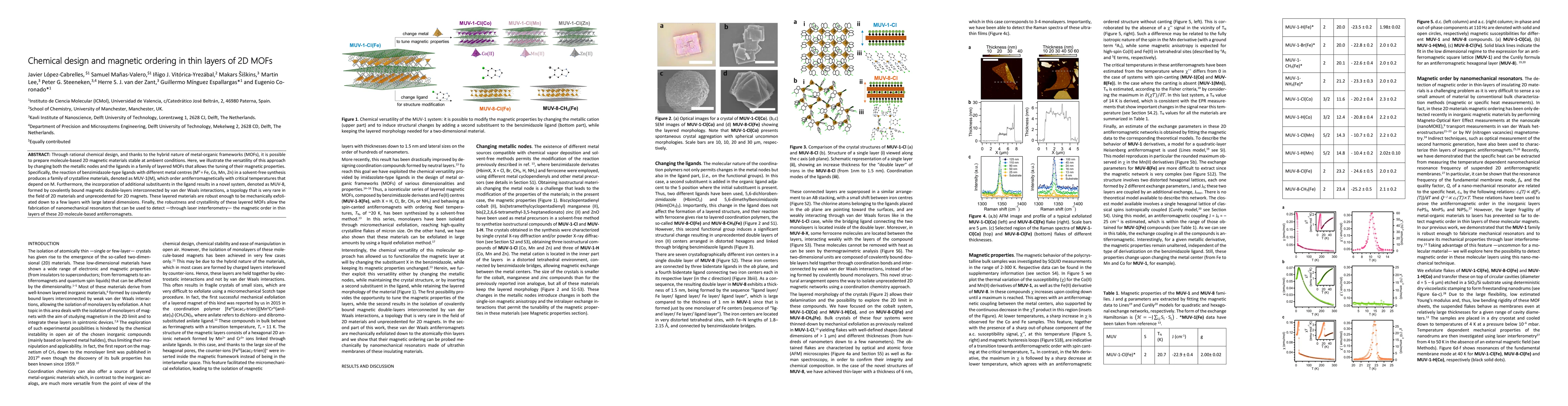 Through rational chemical design, and thanks to the hybrid nature of metal-organic frameworks (MOFs), it is possible to prepare molecule-based 2D magnetic materials stable at ambient conditions. Here, we illustrate the versatility of this approach by changing both the metallic nodes and the ligands in a family of layered MOFs that allows the tuning of their magnetic properties. Specifically, the reaction of benzimidazole-type ligands with different metal centres (MII = Fe, Co, Mn, Zn) in a solvent-free synthesis produces a family of crystalline materials, denoted as MUV-1(M), which order antiferromagnetically with critical temperatures that depend on M. Furthermore, the incorporation of additional substituents in the ligand results in a novel system, denoted as MUV-8, formed by covalently bound magnetic double-layers interconnected by van der Waals interactions, a topology that is very rare in the field of 2D materials and unprecedented for 2D magnets. These layered materials are robust enough to be mechanically exfoliated down to a few layers with large lateral dimensions. Finally, the robustness and crystallinity of these layered MOFs allow the fabrication of nanomechanical resonators that can be used to detect -- through laser interferometry -- the magnetic order in thin layers of these 2D molecule-based antiferromagnets.