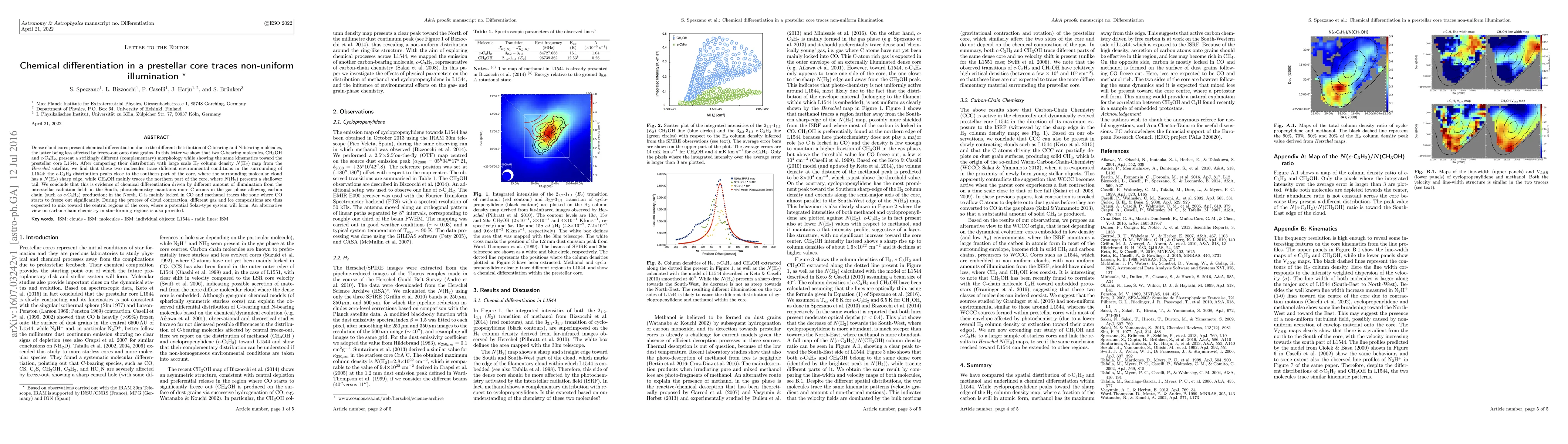 Dense cloud cores present chemical differentiation due to the different distribution of C-bearing and N-bearing molecules, the latter being less affected by freeze-out onto dust grains. In this letter we show that two C-bearing molecules, CH$_3$OH and $c$-C$_3$H$_2$, present a strikingly different (complementary) morphology while showing the same kinematics toward the prestellar core L1544. After comparing their distribution with large scale H$_2$ column density N(H$_2$) map from the Herschel satellite, we find that these two molecules trace different environmental conditions in the surrounding of L1544: the $c$-C$_3$H$_2$ distribution peaks close to the southern part of the core, where the surrounding molecular cloud has a N(H$_2$) sharp edge, while CH$_3$OH mainly traces the northern part of the core, where N(H$_2$) presents a shallower tail. We conclude that this is evidence of chemical differentiation driven by different amount of illumination from the interstellar radiation field: in the South, photochemistry maintains more C atoms in the gas phase allowing carbon chain (such as $c$-C$_3$H$_2$) production; in the North, C is mainly locked in CO and methanol traces the zone where CO starts to freeze out significantly. During the process of cloud contraction, different gas and ice compositions are thus expected to mix toward the central regions of the core, where a potential Solar-type system will form. An alternative view on carbon-chain chemistry in star-forming regions is also provided.