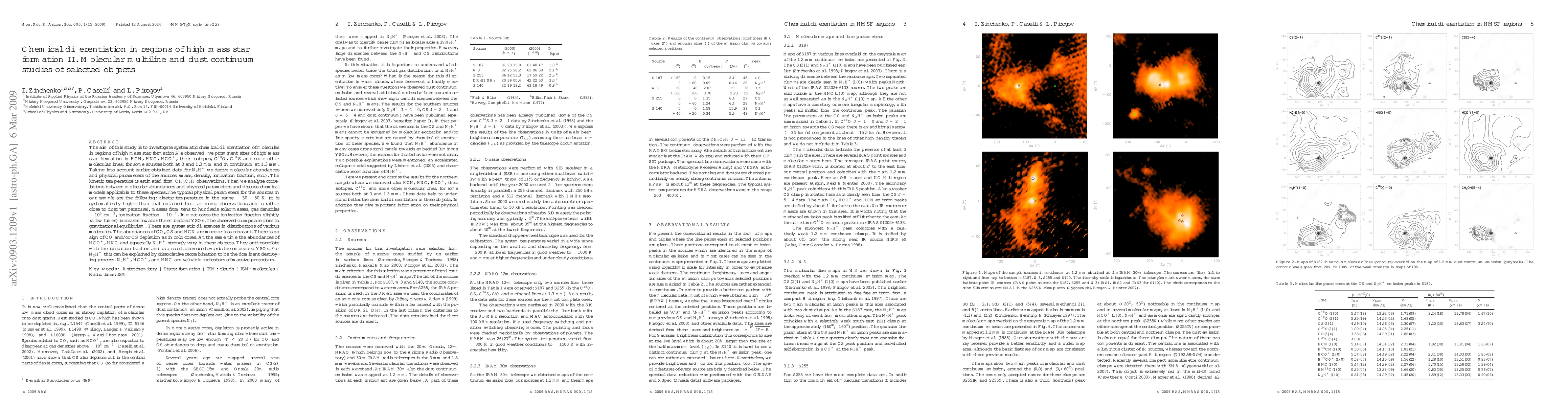 The aim of this study is to investigate systematic chemical differentiation of molecules in regions of high mass star formation. We observed five prominent sites of high mass star formation in HCN, HNC, HCO+, their isotopes, C18O, C34S and some other molecular lines, for some sources both at 3 and 1.3 mm and in continuum at 1.3 mm. Taking into account earlier obtained data for N2H+ we derive molecular abundances and physical parameters of the sources (mass, density, ionization fraction, etc.). The kinetic temperature is estimated from CH3C2H observations. Then we analyze correlations between molecular abundances and physical parameters and discuss chemical models applicable to these species. The typical physical parameters for the sources in our sample are the following: kinetic temperature in the range ~ 30-50 K (it is systematically higher than that obtained from ammonia observations and is rather close to dust temperature), masses from tens to hundreds solar masses, gas densities ~ 10^5 cm^{-3}, ionization fraction ~ 10^{-7}. In most cases the ionization fraction slightly (a few times) increases towards the embedded YSOs. The observed clumps are close to gravitational equilibrium. There are systematic differences in distributions of various molecules. The abundances of CO, CS and HCN are more or less constant. There is no sign of CO and/or CS depletion as in cold cores. At the same time the abundances of HCO+, HNC and especially N2H+ strongly vary in these objects. They anti-correlate with the ionization fraction and as a result decrease towards the embedded YSOs. For N2H+ this can be explained by dissociative recombination to be the dominant destroying process. N2H+, HCO+, and HNC are valuable indicators of massive protostars.