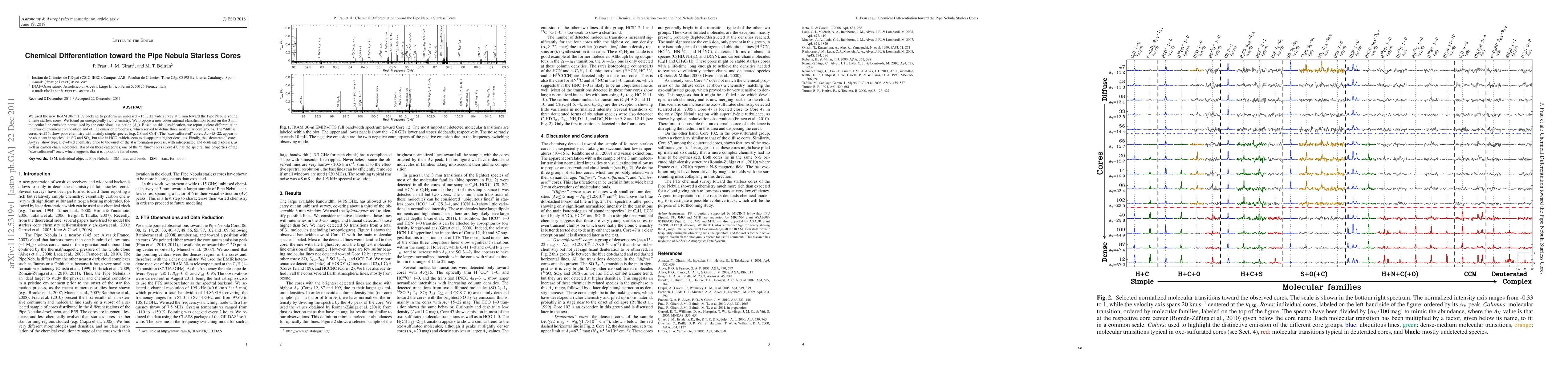 We used the new IRAM 30-m FTS backend to perform an unbiased ~15 GHz wide survey at 3 mm toward the Pipe Nebula young diffuse starless cores. We found an unexpectedly rich chemistry. We propose a new observational classification based on the 3 mm molecular line emission normalized by the core visual extinction (Av). Based on this classification, we report a clear differentiation in terms of chemical composition and of line emission properties, which served to define three molecular core groups. The "diffuse" cores, Av<~15, show poor chemistry with mainly simple species (e.g. CS and CCH). The "oxo-sulfurated" cores, Av~15--22, appear to be abundant in species like SO and SO2, but also in HCO, which seem to disappear at higher densities. Finally, the "deuterated" cores, Av>~22, show typical evolved chemistry prior to the onset of the star formation process, with nitrogenated and deuterated species, as well as carbon chain molecules. Based on these categories, one of the "diffuse" cores (Core 47) has the spectral line properties of the "oxo-sulfurated" ones, which suggests that it is a possible failed core.