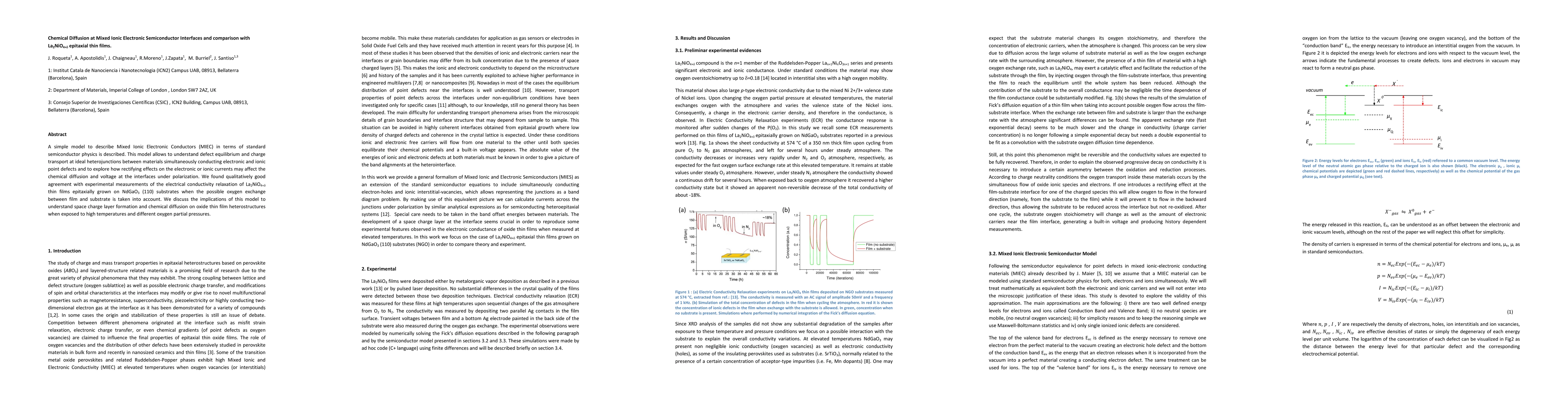 This paper proposes a model for understanding chemical diffusion at interfaces of mixed ionic electronic conductors (MIEC) using semiconductor physics principles. It demonstrates good agreement with experimental data on La2NiO4+d thin films, highlighting implications for space charge layer formation and chemical diffusion in oxide heterostructures under varying conditions.