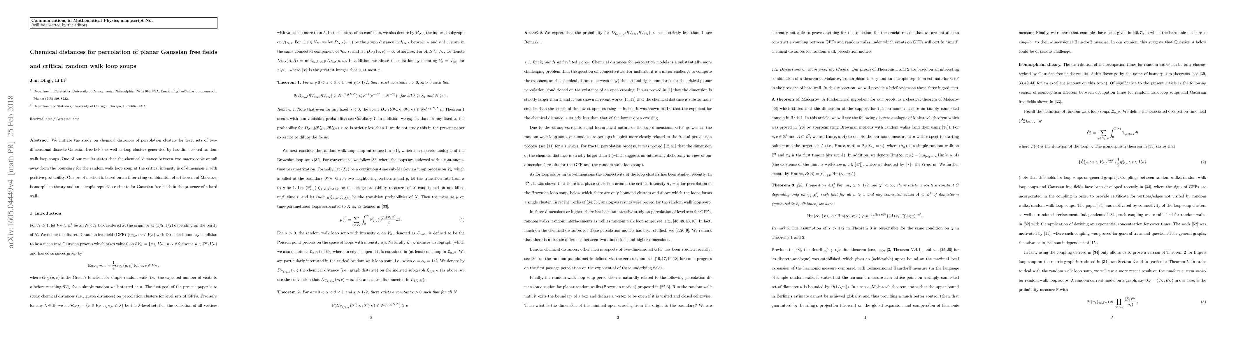 This paper explores the chemical distances in percolation clusters of planar Gaussian free fields and random walk loop soups, revealing that the chemical distance between two macroscopic annuli in a critical random walk loop soup is dimensionally 1 with positive probability. The proof leverages a combination of Makarov's theorem, isomorphism theory, and an entropic repulsion estimate for Gaussian free fields.