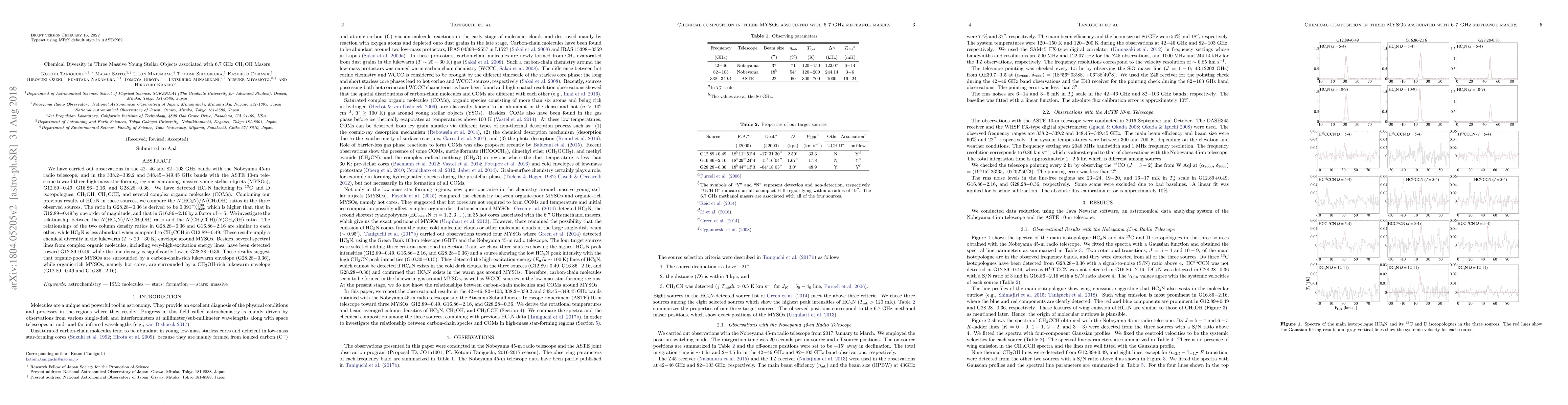We have carried out observations in the 42$-$46 and 82$-$103 GHz bands with the Nobeyama 45-m radio telescope, and in the 338.2$-$339.2 and 348.45$-$349.45 GHz bands with the ASTE 10-m telescope toward three high-mass star-forming regions containing massive young stellar objects (MYSOs), G12.89+0.49, G16.86$-$2.16, and G28.28$-$0.36. We have detected HC$_{3}$N including its $^{13}$C and D isotopologues, CH$_{3}$OH, CH$_{3}$CCH, and several complex organic molecules (COMs). Combining our previous results of HC$_{5}$N in these sources, we compare the $N$(HC$_{5}$N)/$N$(CH$_{3}$OH) ratios in the three observed sources. The ratio in G28.28$-$0.36 is derived to be $0.091^{+0.109}_{-0.039}$, which is higher than that in G12.89+0.49 by one order of magnitude, and that in G16.86$-$2.16 by a factor of $\sim 5$. We investigate the relationship between the $N$(HC$_{5}$N)/$N$(CH$_{3}$OH) ratio and the $N$(CH$_{3}$CCH)/$N$(CH$_{3}$OH) ratio. The relationships of the two column density ratios in G28.28$-$0.36 and G16.86$-$2.16 are similar to each other, while HC$_{5}$N is less abundant when compared to CH$_{3}$CCH in G12.89+0.49. These results imply a chemical diversity in the lukewarm ($T \sim 20-30$ K) envelope around MYSOs. Besides, several spectral lines from complex organic molecules, including very-high-excitation energy lines, have been detected toward G12.89+0.49, while the line density is significantly low in G28.28$-$0.36. These results suggest that organic-poor MYSOs are surrounded by a carbon-chain-rich lukewarm envelope (G28.28$-$0.36), while organic-rich MYSOs, namely hot cores, are surrounded by a CH$_{3}$OH-rich lukewarm envelope (G12.89+0.49 and G16.86$-$2.16).