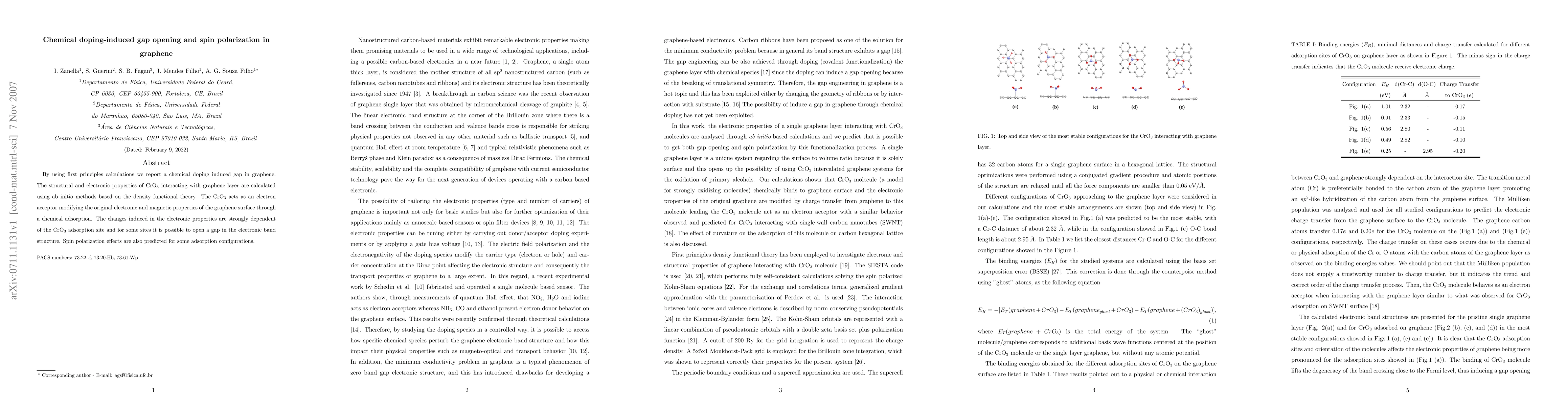 Summary: This study uses first principles calculations to demonstrate that chemical doping with CrO$_3$ can induce a gap opening and spin polarization in graphene, depending on the adsorption site, thereby modifying its electronic and magnetic properties.