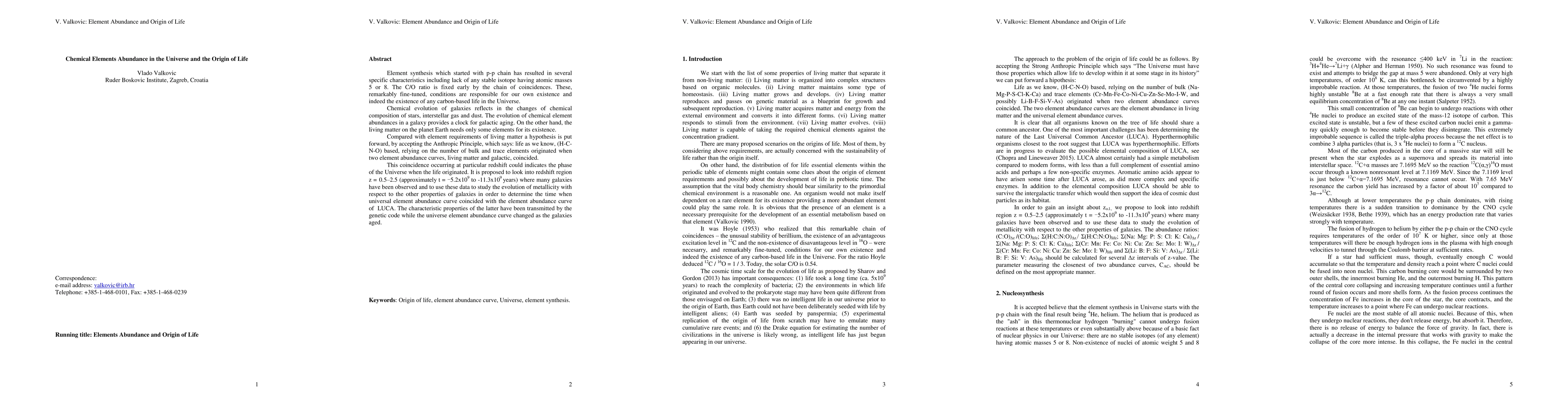 Element synthesis which started with p-p chain has resulted in several specific characteristics including lack of any stable isotope having atomic masses 5 or 8. The carbon to oxygen ratio is fixed early by the chain of coincidences. These, remarkably fine-tuned, conditions are responsible for our own existence and indeed the existence of any carbon based life in the Universe. Chemical evolution of galaxies reflects in the changes of chemical composition of stars, interstellar gas and dust. The evolution of chemical element abundances in a galaxy provides a clock for galactic aging. On the other hand, the living matter on the planet Earth needs only some elements for its existence. Compared with element requirements of living matter a hypothesis is put forward, by accepting the Anthropic Principle, which says: life as we know, (H-C-N-O) based, relying on the number of bulk and trace elements originated when two element abundance curves, living matter and galactic, coincided. This coincidence occurring at particular redshift could indicates the phase of the Universe when the life originated. It is proposed to look into redshift region z = 0.5 to 2.5 (approximately t = -5.2x10E9 to -11.3x10E9 years) where many galaxies have been observed and to use these data to study the evolution of metallicity with respect to the other properties of galaxies in order to determine the time when universal element abundance curve coincided with the element abundance curve of LUCA. The characteristic properties of the latter have been transmitted by the genetic code while the universe element abundance curve changed as the galaxies aged.