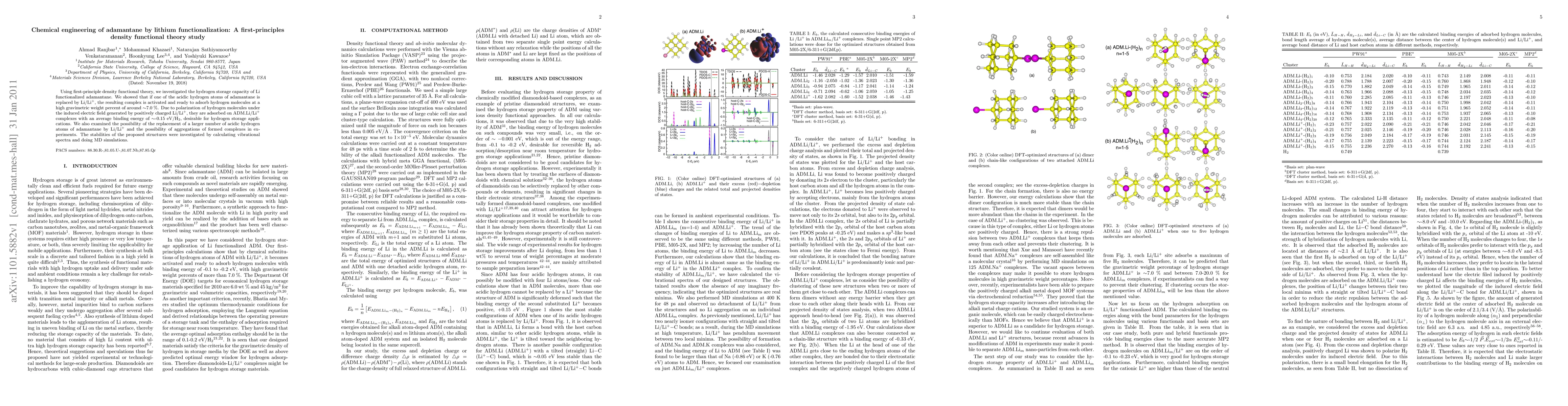 Researchers used first-principles density functional theory to discover that lithium-functionalized adamantane can store hydrogen at a high weight percent, with an average binding energy of -0.15 eV/H2. This could be a promising material for hydrogen storage applications.