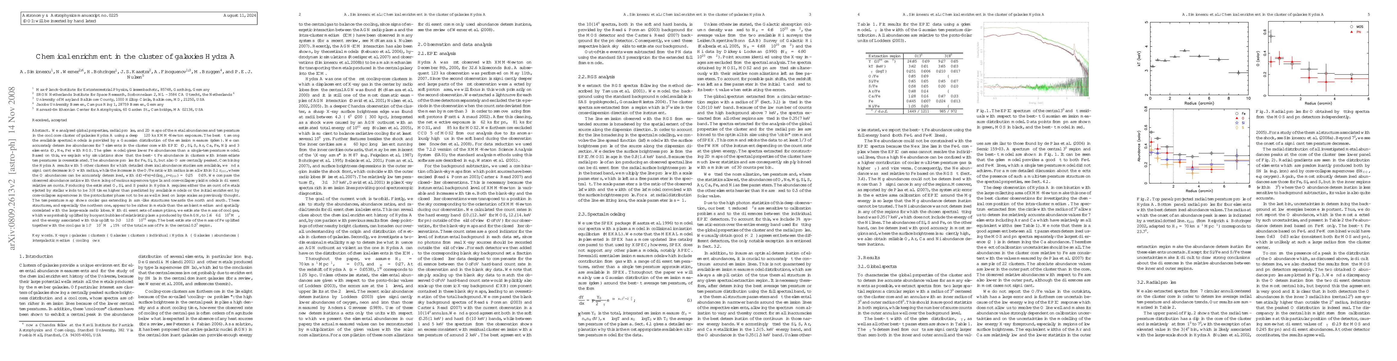 This study uses XMM-Newton data to analyze the chemical enrichment in Hydra A, revealing centrally peaked abundances for Fe, Si, S, and O, and a significant radial decrease in O. The findings suggest that either stellar winds or core-collapse supernovae from the protocluster phase are responsible for the observed metal peaks, with cooler, metal-rich gas extending in arm-like structures correlated with radio lobes.