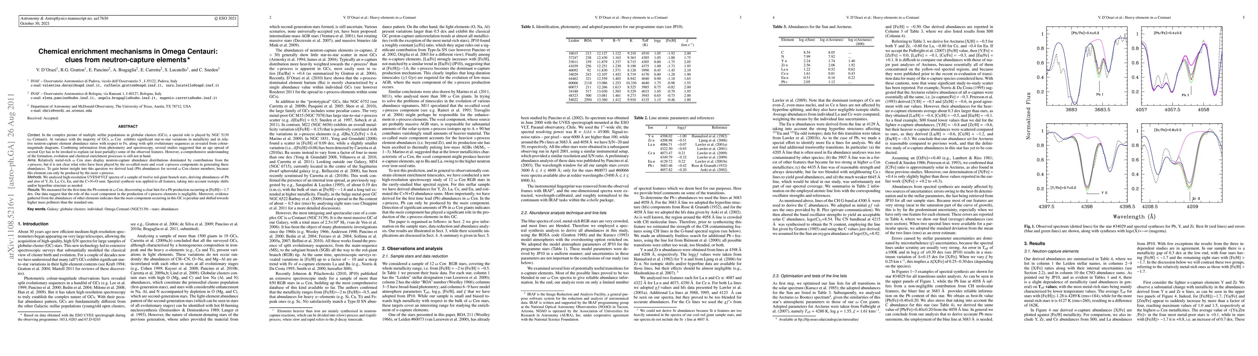 This study investigates the chemical enrichment mechanisms in Omega Centauri, revealing significant star-to-star variations in neutron-capture element abundances. The analysis of lead (Pb) in red-giant branch stars suggests that Pb production occurs at higher metallicity, indicating a negligible role of the weak s-process and a peculiar main s-process component in the cluster's chemical evolution.