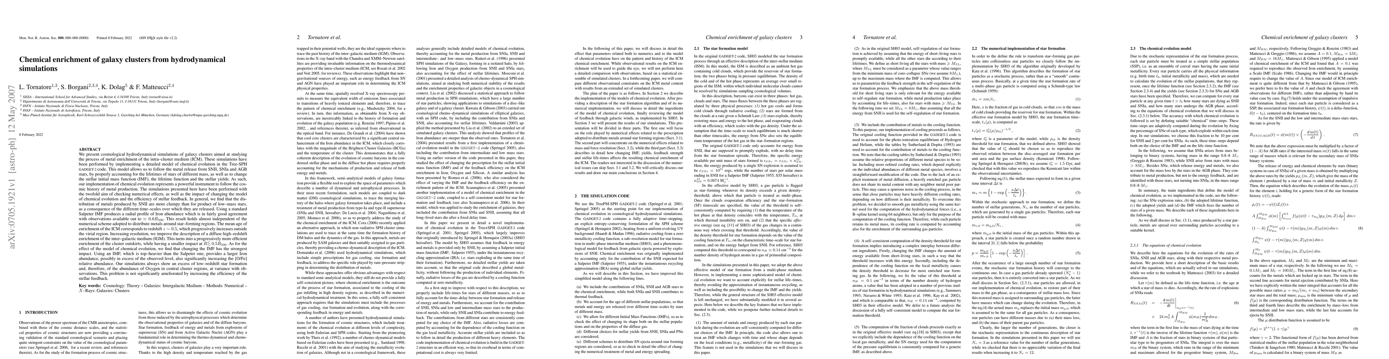 This paper uses cosmological hydrodynamical simulations to study metal enrichment in galaxy clusters, employing a detailed chemical evolution model to track metal release from supernovae and stellar processes. The study aims to assess numerical effects and the influence of varying chemical evolution and stellar feedback efficiency.