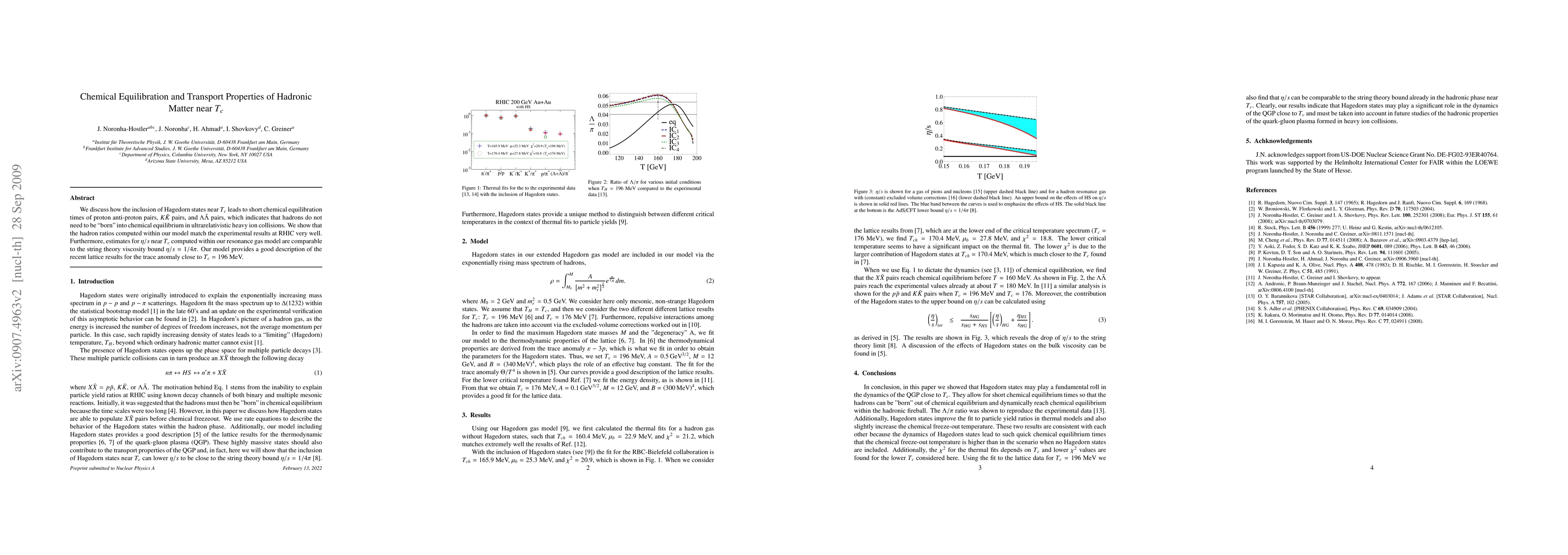 We discuss how the inclusion of Hagedorn states near $T_c$ leads to short chemical equilibration times of proton anti-proton pairs, $K\bar{K}$ pairs, and $\Lambda\bar{\Lambda}$ pairs, which indicates that hadrons do not need to be "born" into chemical equilibrium in ultrarelativistic heavy ion collisions. We show that the hadron ratios computed within our model match the experimental results at RHIC very well. Furthermore, estimates for $\eta/s$ near $T_c$ computed within our resonance gas model are comparable to the string theory viscosity bound $\eta/s=1/4\pi$. Our model provides a good description of the recent lattice results for the trace anomaly close to $T_c=196$ MeV.