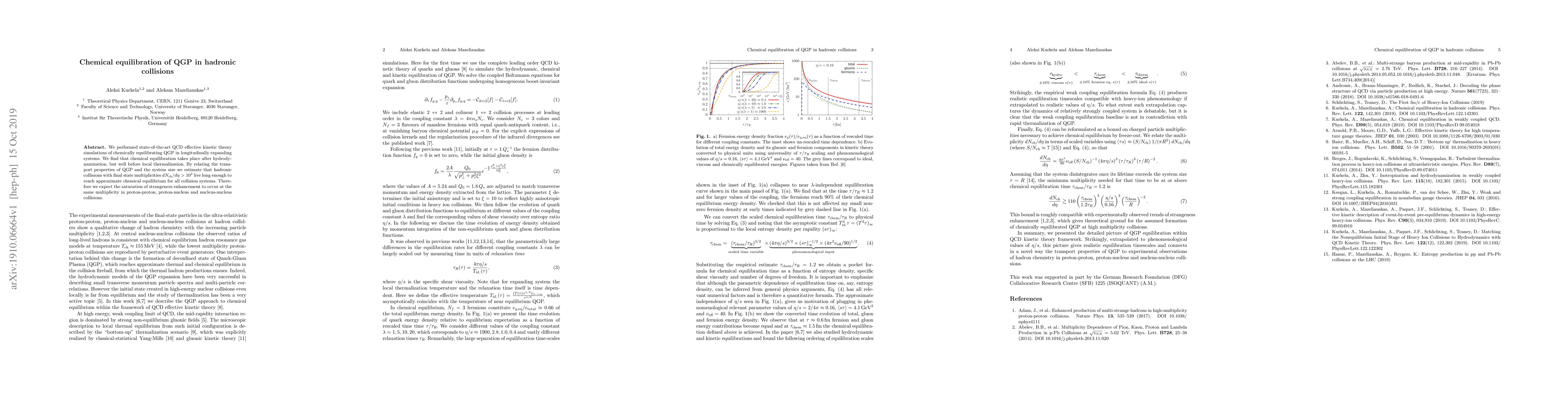 QCD effective kinetic theory simulations were performed to study chemical equilibration of QGP in hadronic collisions.