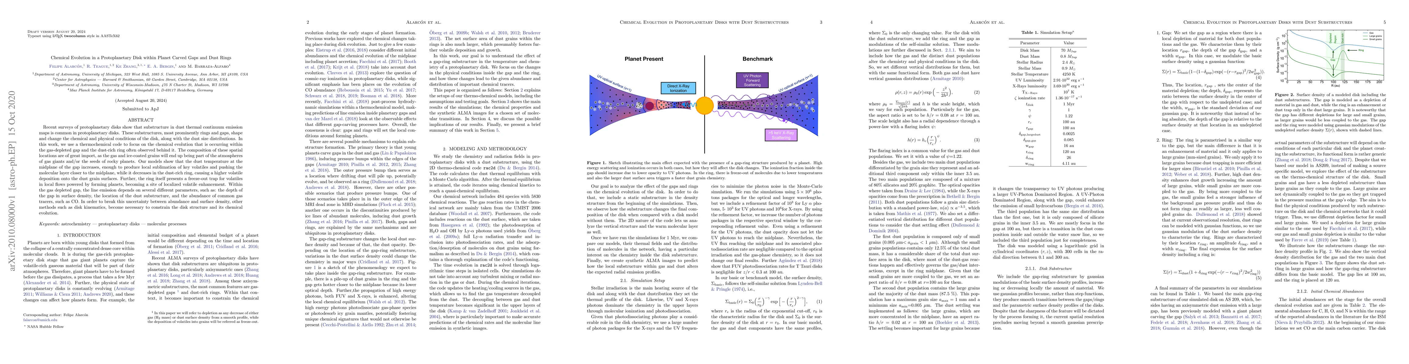 Recent surveys of protoplanetary disks show that substructure in dust thermal continuum emission maps is common in protoplanetary disks. These substructures, most prominently rings and gaps, shape and change the chemical and physical conditions of the disk, along with the dust size distributions. In this work, we use a thermochemical code to focus on the chemical evolution that is occurring within the gas-depleted gap and the dust-rich ring often observed behind it. The composition of these spatial locations are of great import, as the gas and ice-coated grains will end up being part of the atmospheres of gas giants and/or the seeds of rocky planets. Our models show that the dust temperature at the midplane of the gap increases, enough to produce local sublimation of key volatiles and pushing the molecular layer closer to the midplane, while it decreases in the dust-rich ring, causing a higher volatile deposition onto the dust grain surfaces. Further, the ring itself presents a freeze-out trap for volatiles in local flows powered by forming planets, becoming a site of localized volatile enhancement. Within the gas depleted gap, the line emission depends on several different parameters, such as: the depth of the gap in surface density, the location of the dust substructure, and the abundance of common gas tracers, such as CO. In order to break this uncertainty between abundance and surface density, other methods such as disk kinematics, become necessary to constrain the disk structure and its chemical evolution.